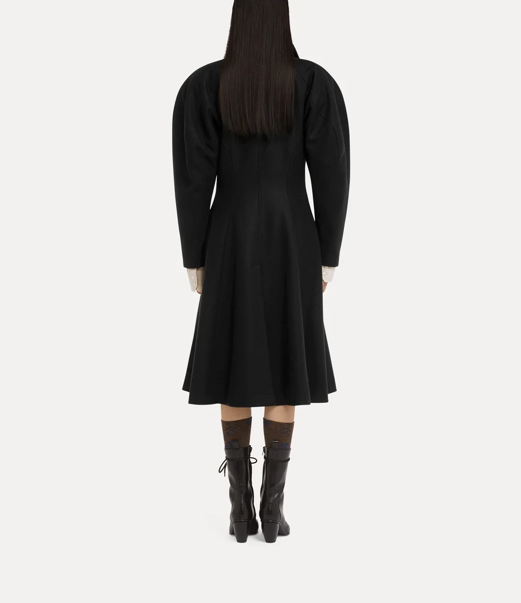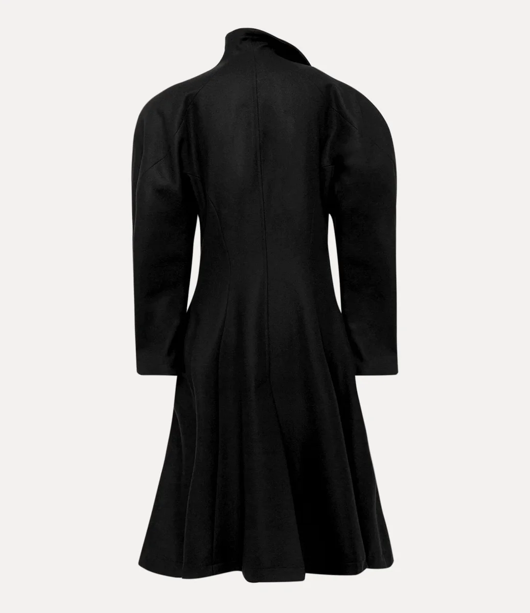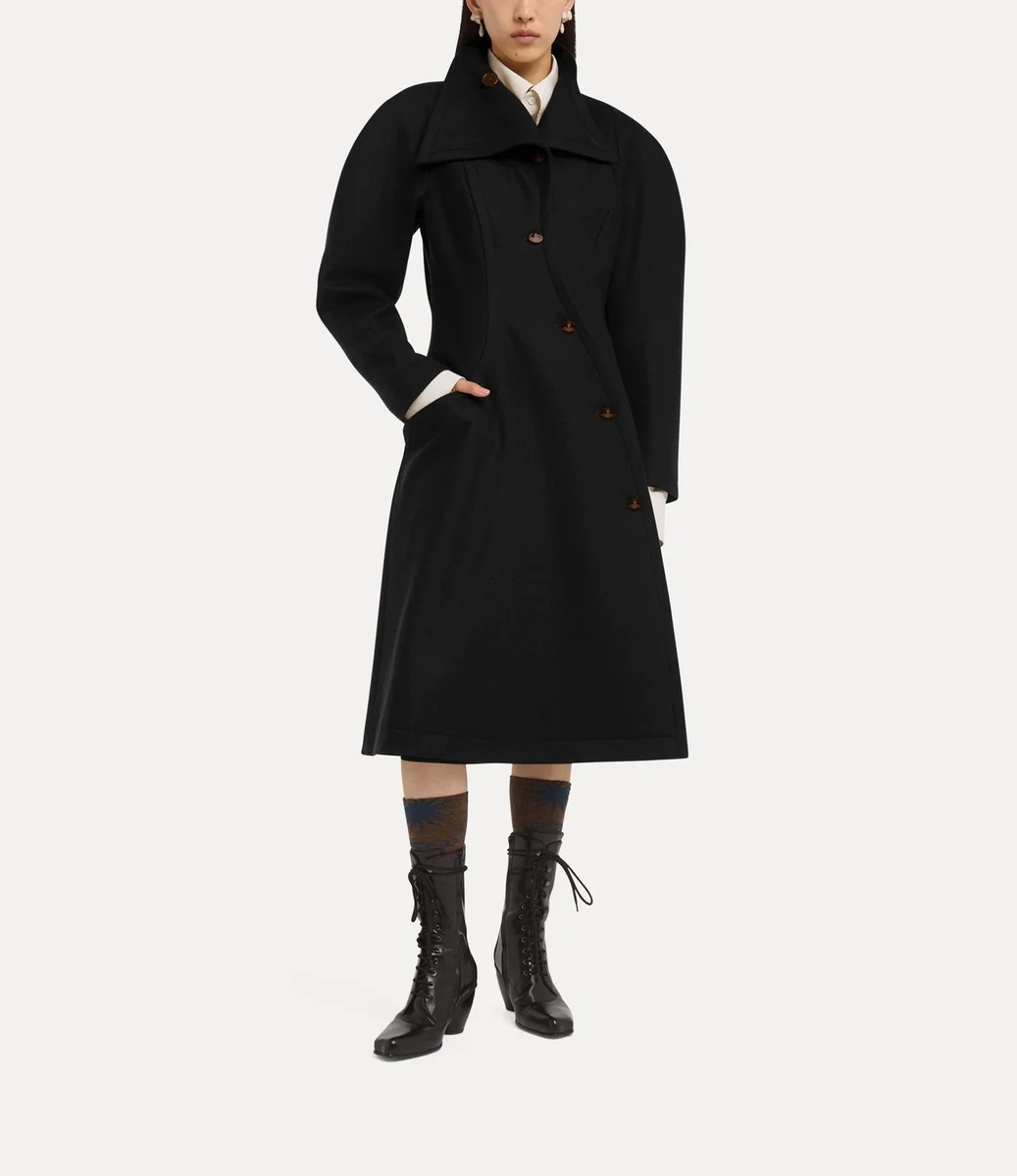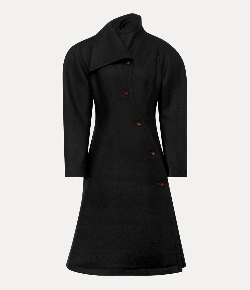 Breeze-kappan har en asymmetrisk enkelknäppt framsida som stängs med ovala knappar graverade med det fina ”Line Orb”-motivet – en hyllning till Viviennes vision om att blanda tradition med framtiden. Kappan är tillverkad av en blandning av ull och kashmir och har överdrivet rundade axlar, en skarpt konturerad midja och en utsvängd fåll, vilket skapar en skräddarsydd silhuett.