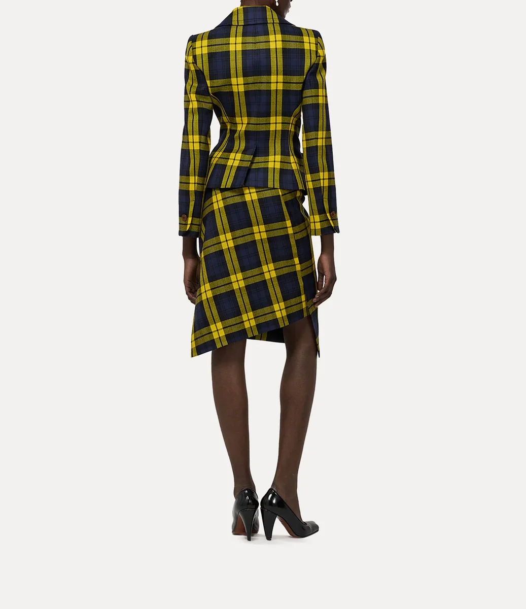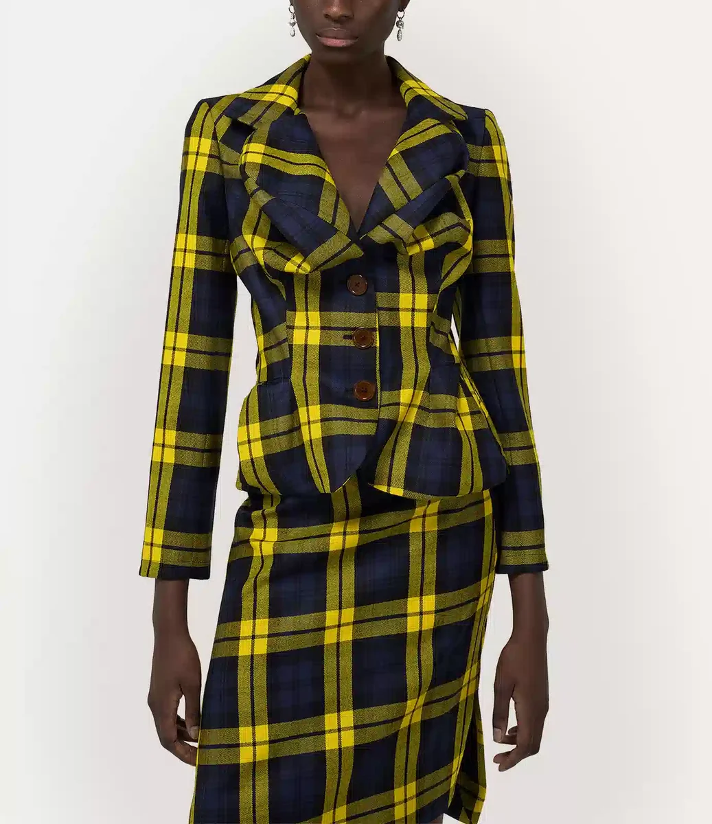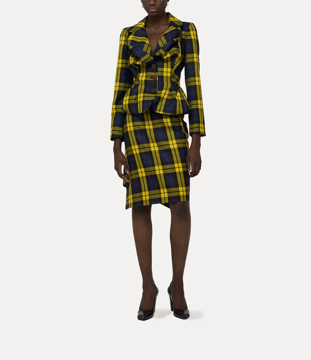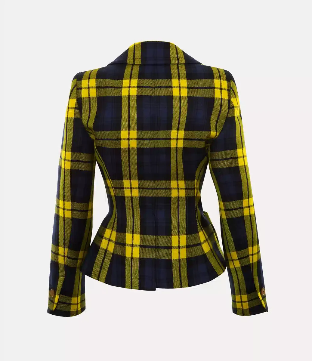 Drunken-jackan använder Viviennes originella experimentella skräddarsydda mönsterskärningssystem – där plaggets element förvrängs och får en nästan surrealistisk form. Plagget har säsongens ulltartan ”Moonshine” med livfulla nyanser och knappar framtill.