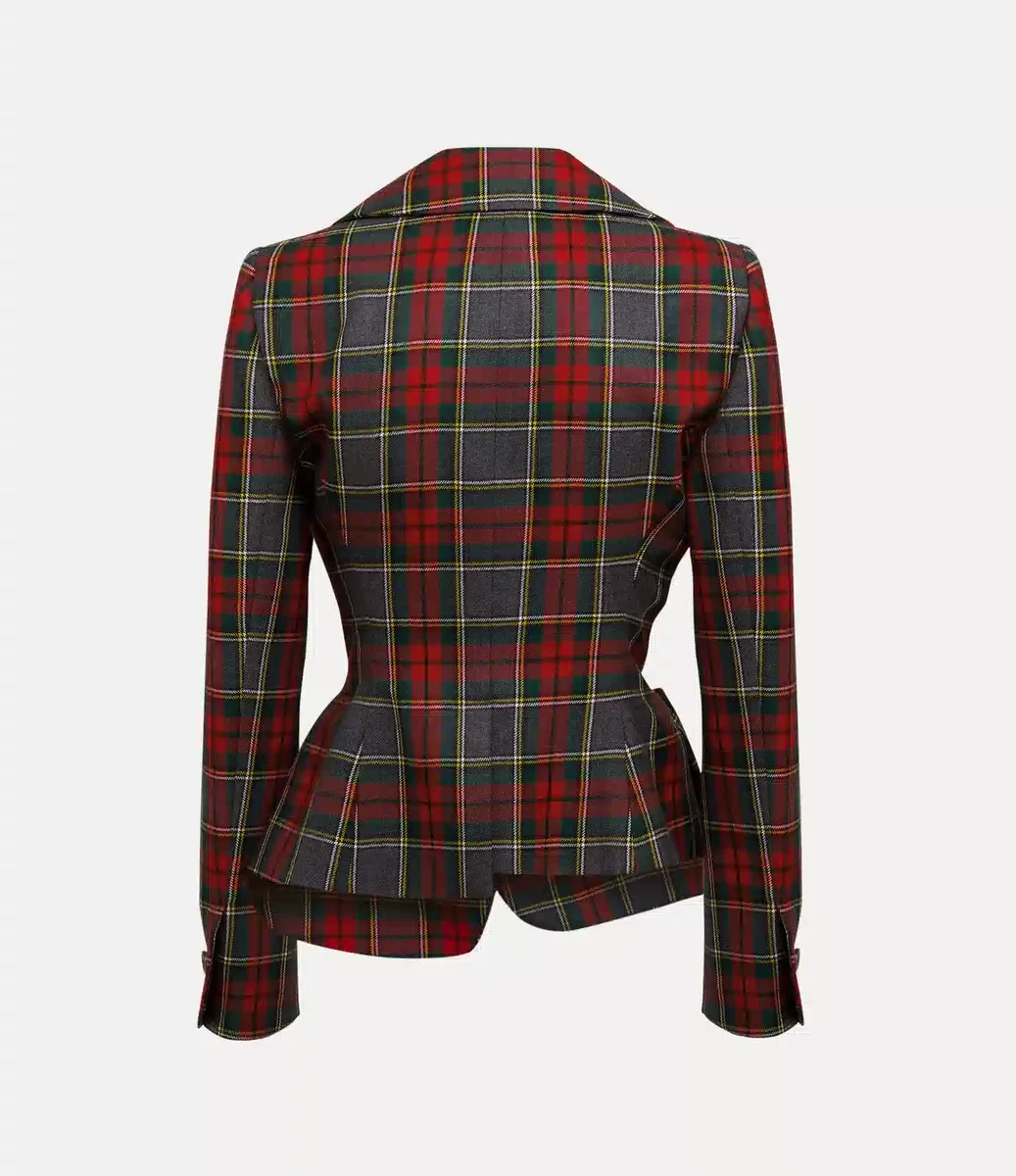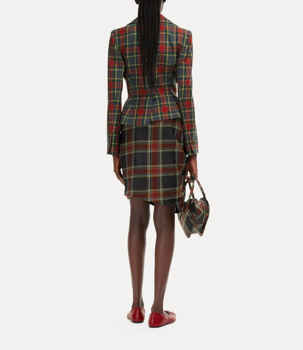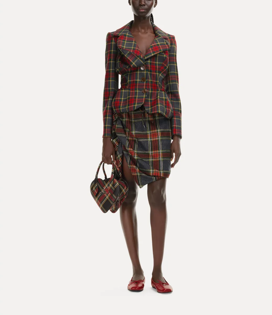 Vår Drunken-jacka är tillverkad med Viviennes originella experimentella skräddarsydda mönsterskärningssystem – där plaggets delar är förvrängda och får en nästan surrealistisk form. Plagget finns denna säsong i den livfulla tartanmönstret ”Scarlet” och har knäppning framtill.