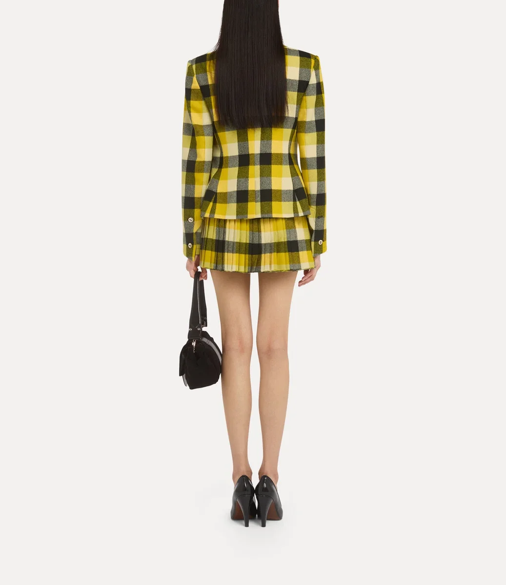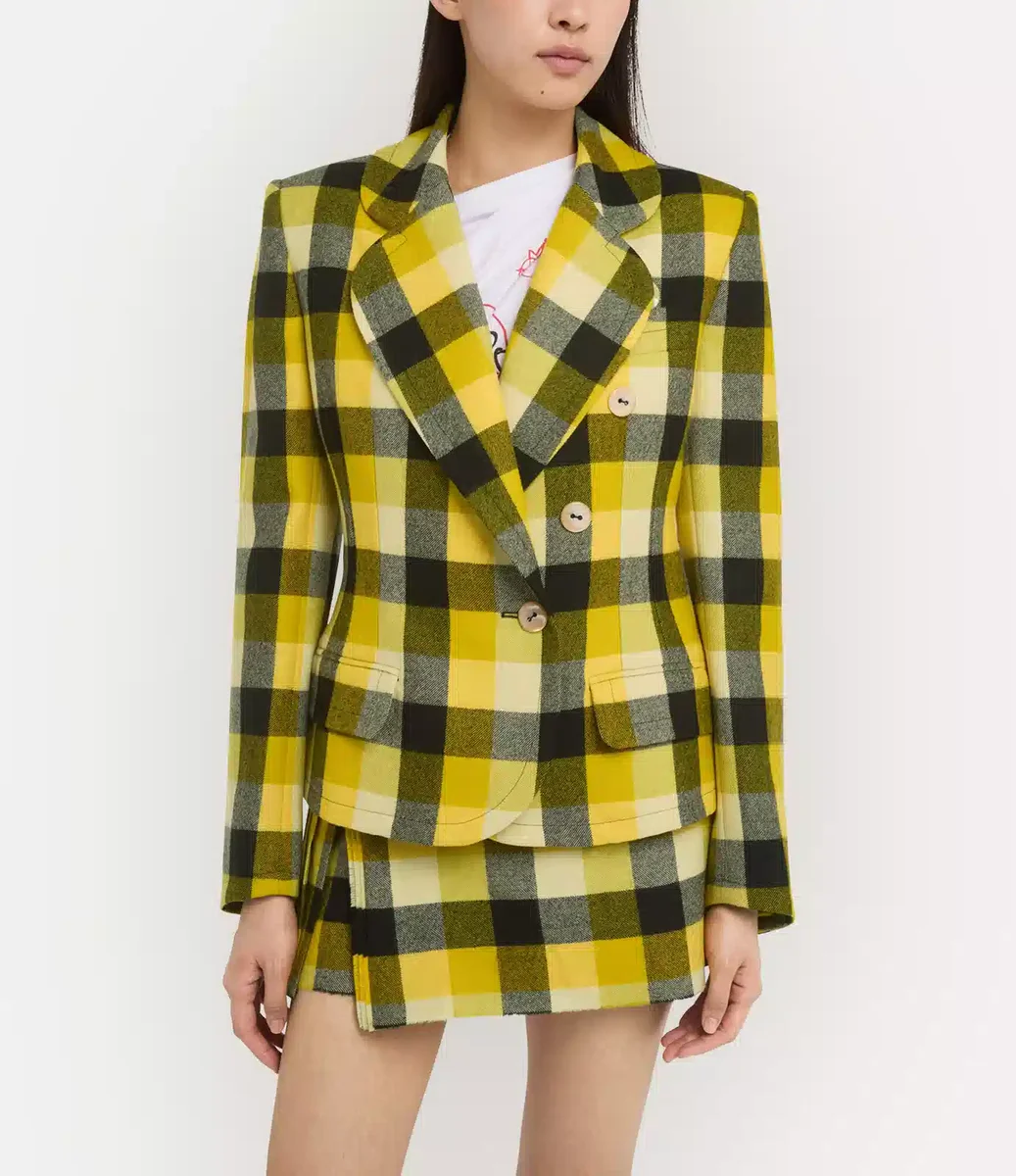 Georgia-jackan är tillverkad i ull och har säsongens ”Pixel”-rutmönster i livfulla nyanser och pärlemorknappar. Den har en enkelknäppt silhuett med mjukt rundade slag och är insvängd i midjan med skräddarsydda insnitt.