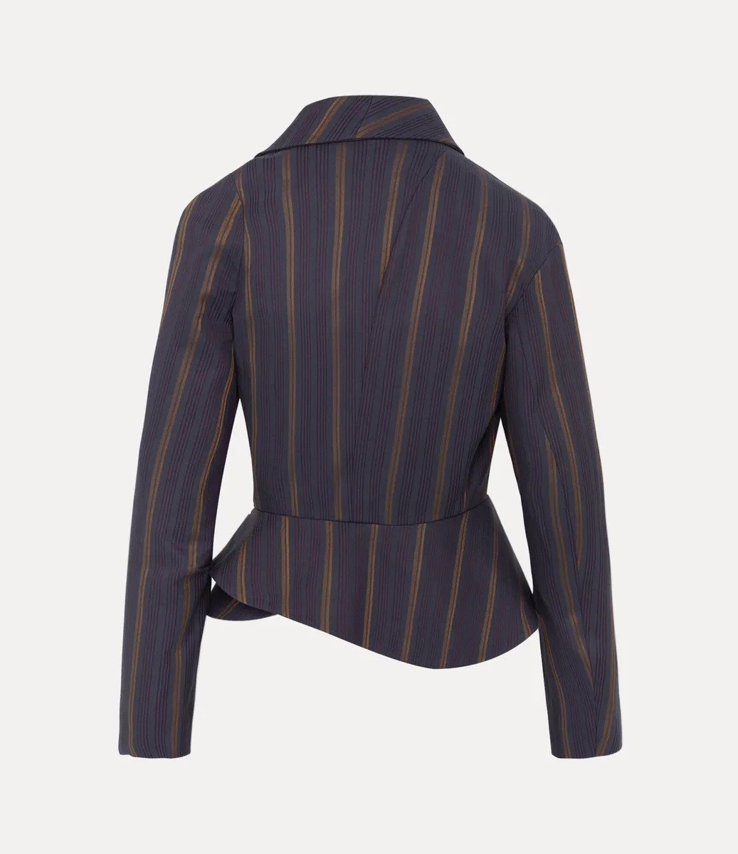 Vår Stormy-jacka är tillverkad av en mjuk bomullsblandning och har en marinblå bas med fina vertikala ränder i guld och vinrött, inramade av en draperad sjalkrage. Delikata insnitt formar midjan och övergår i en skulpterad peplum-fåll, medan ett lekfullt ”Coffee Stain”-motiv accentuerar insidan.