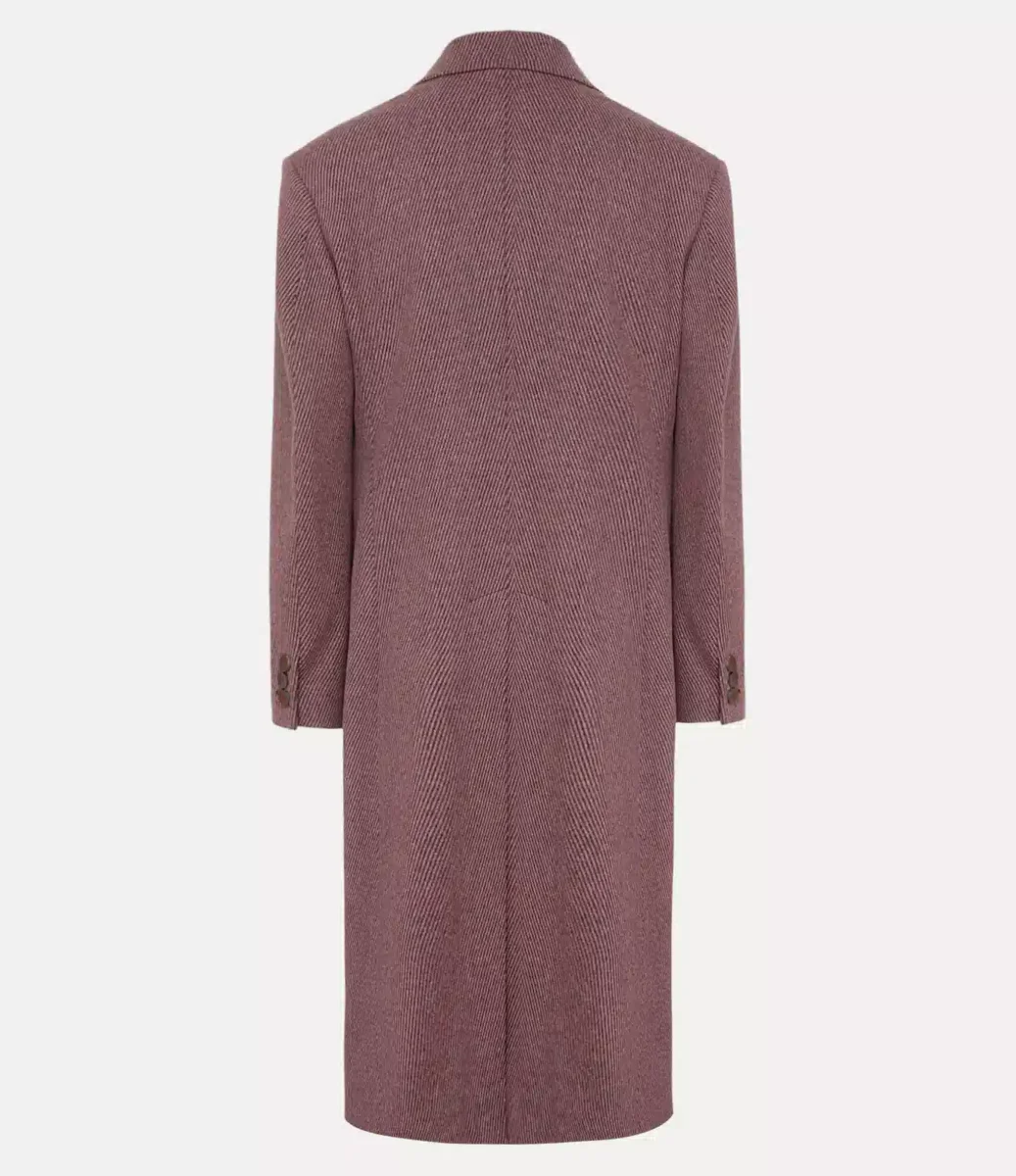 Vår Winston-kappa har en strukturerad ullprofil med diagonal twillväv i en dämpad burgundyfärg. Plagget har en dubbelknäppt framsida med breda spetsiga slag och säkra knappar framtill.