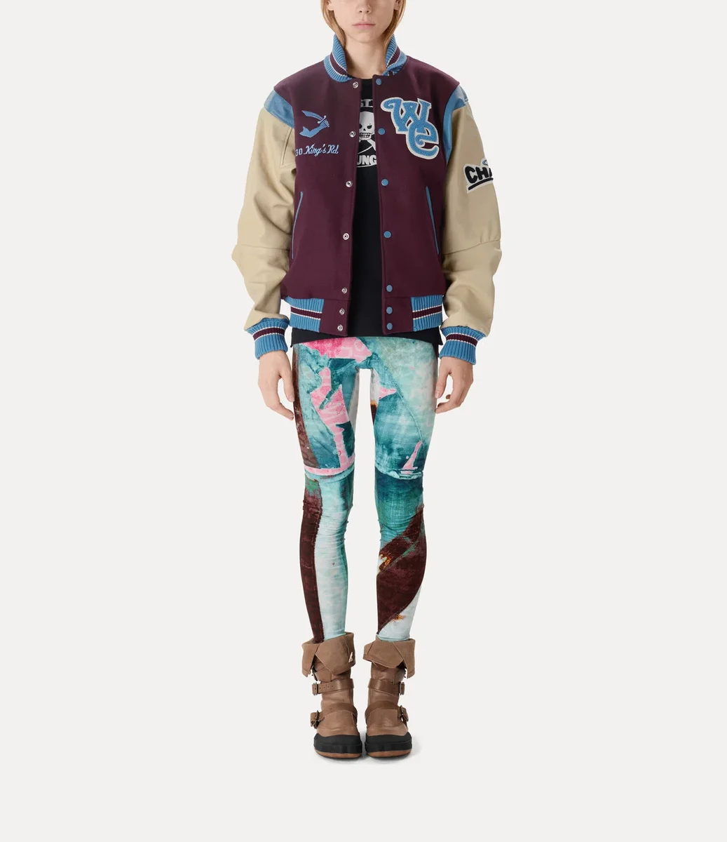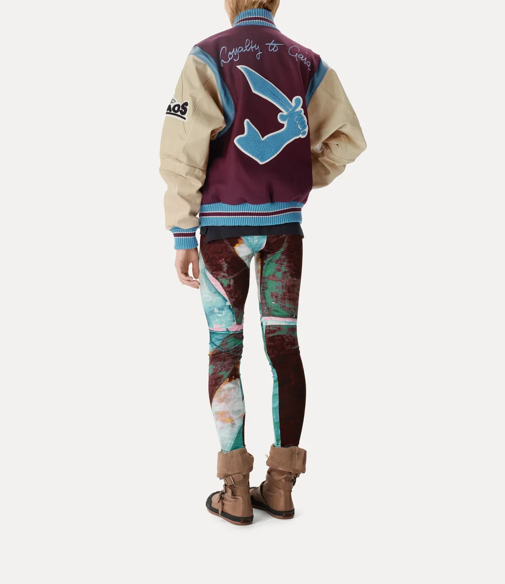 Vår Worlds End Letterman-jacka har en bomberinspirerad silhuett med detaljer som läderärmar och kontrasterande ribbade kanter. Framsidan pryds av ett arm- och sabelmotiv samt adressen till vår Worlds End-butik, medan baksidan har texten ”Loyalty to Gaia” – en hyllning till Viviennes engagemang för klimataktivism.