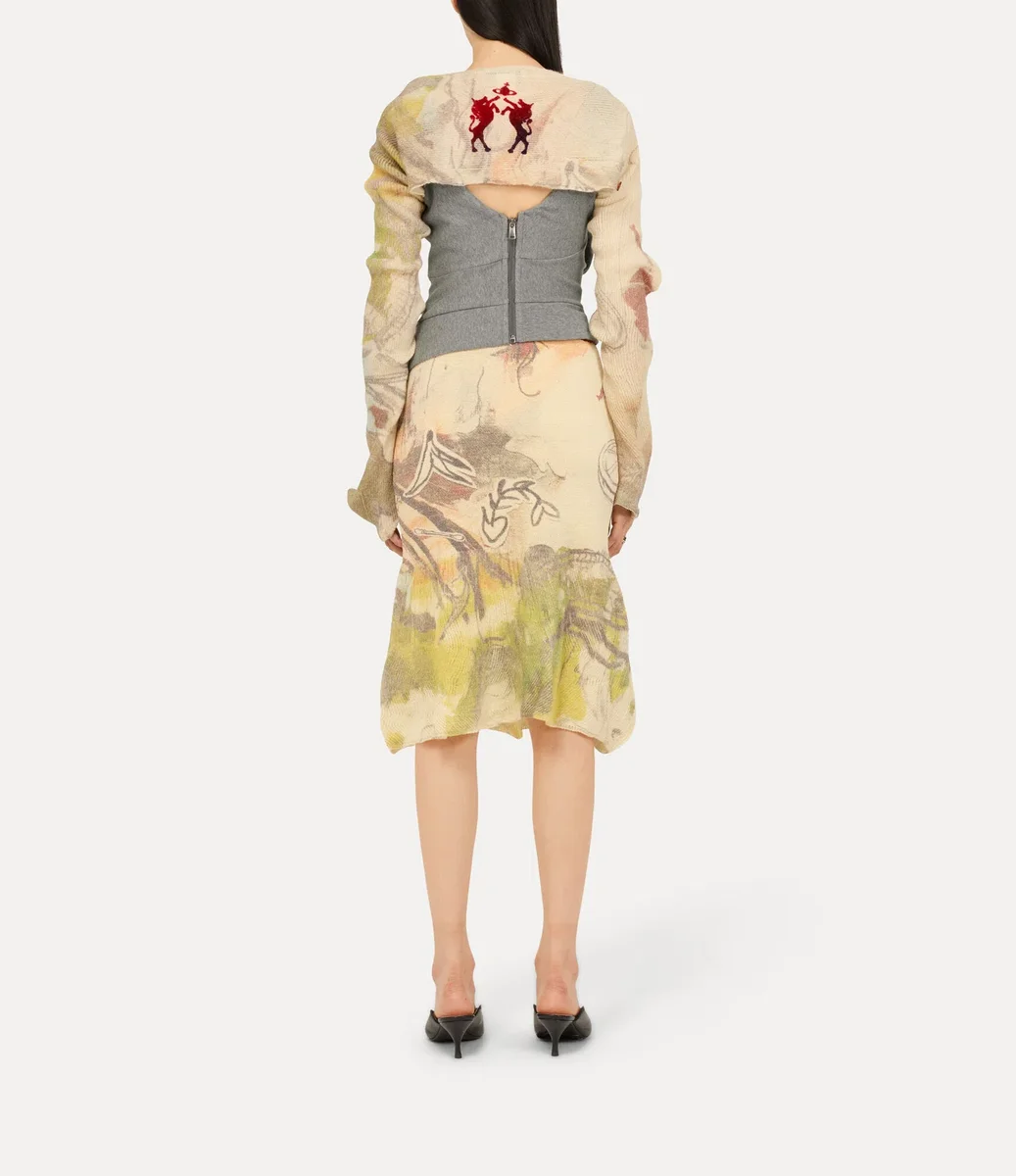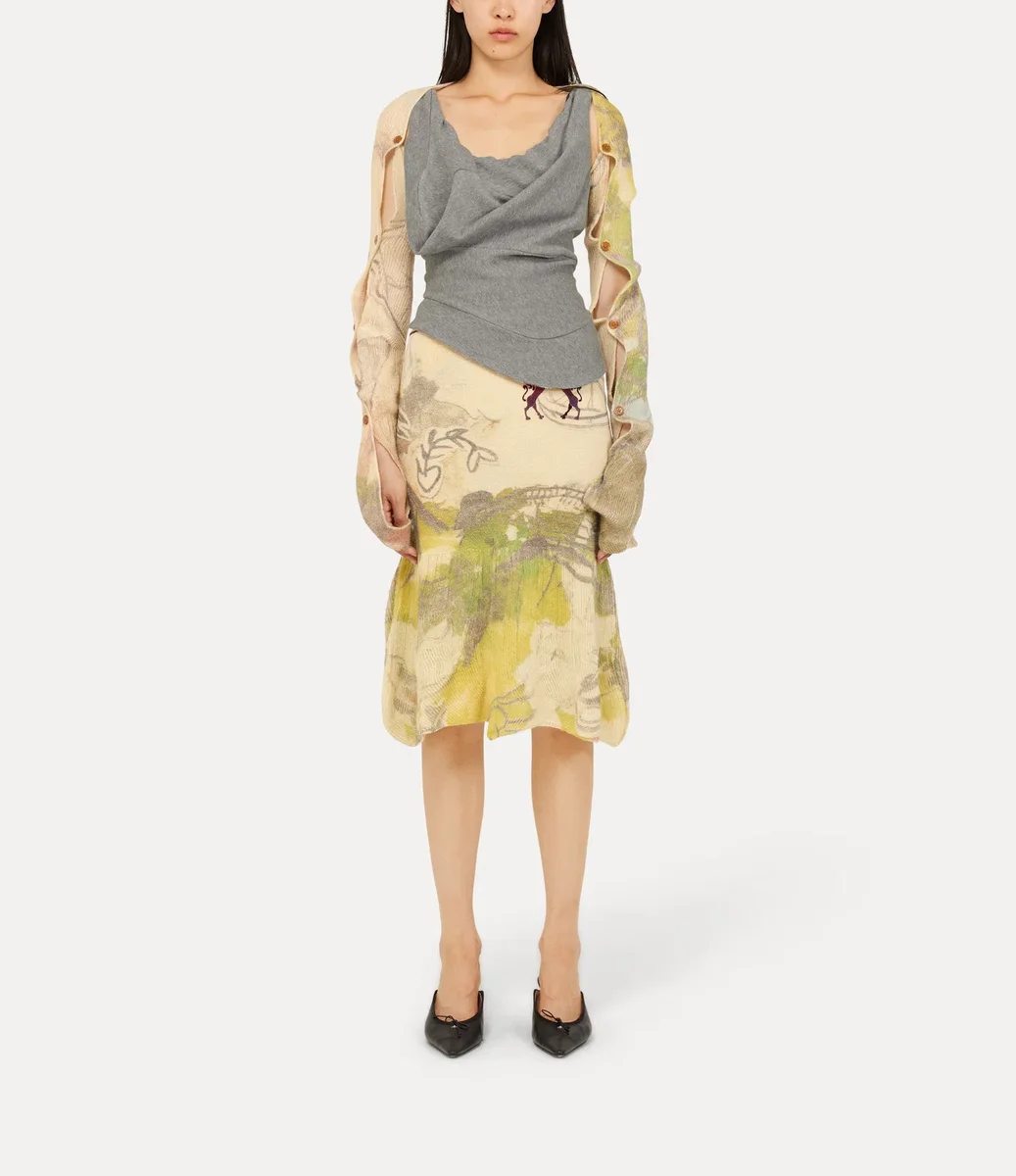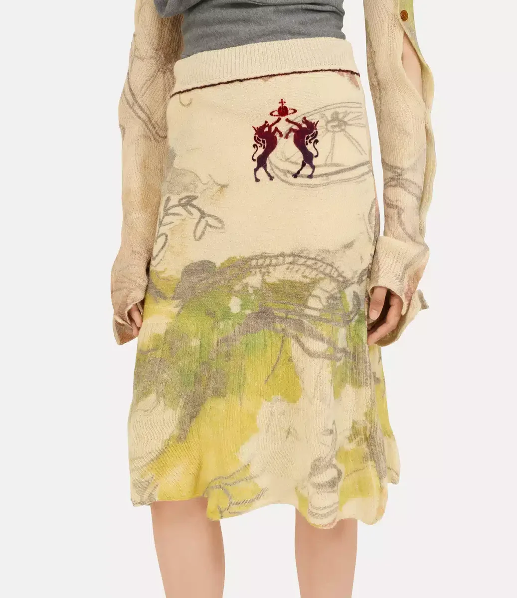 Vår Kyle-kjol är tillverkad av mjuk ull och stickad i ribbstickning över hela plagget. Den är tryckt med konstnären Dominic Myatts konstverk ”Paradise” för denna säsong, som föreställer en värld full av skräp i en ironisk vision av utopin. Designen pryds av motivet ”Horses with Orb” på höften och har en röd och blå ombré-effekt.