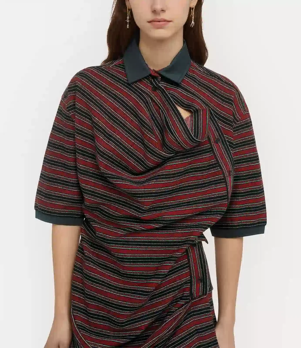 Ming Polo Dress har vår signaturteknik för mönsterskärning, ”Ming”, som först introducerades i Andreas Kronthalers kollektion, där plaggets form är konstnärligt förvrängd för att skapa en nästan surrealistisk silhuett. Plagget har säsongens arkivinspirerade randiga motiv med en excentrisk knäppning och drapering vid halsringningen, som faller i en asymmetrisk fåll.
