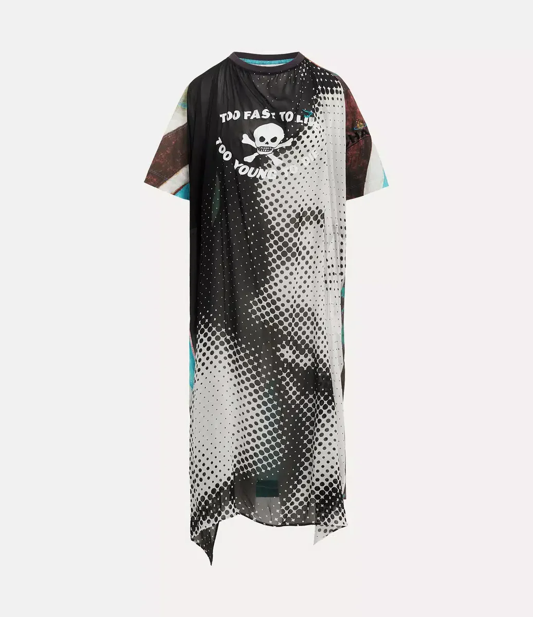 Worlds End Swing-klänningen är prydd med husets signaturmotiv Union Jack på ärmarna och baksidan. Plagget kompletteras med skalle- och korsben-emblemet och sloganen ”Too Fast to Live, Too Young to Die”, hämtad från skylten på vår ikoniska butik, nu känd som Worlds’ End.