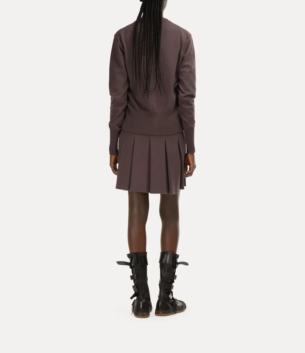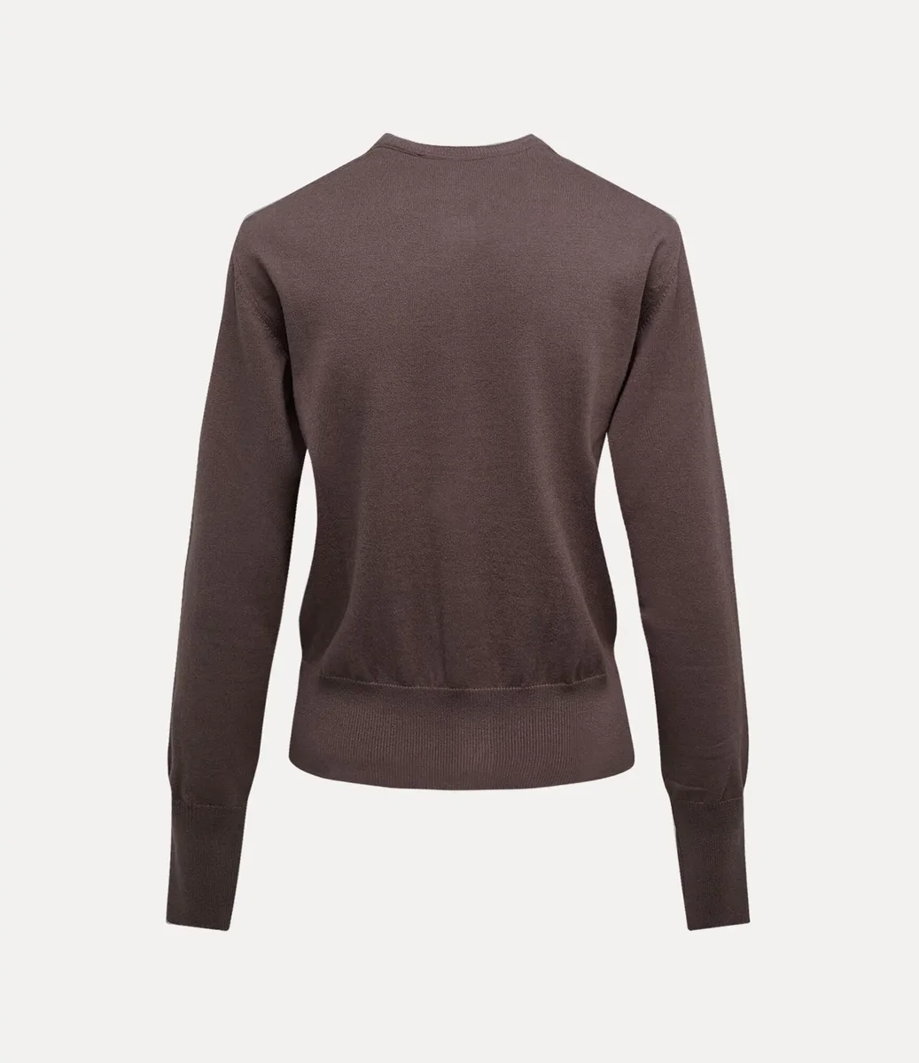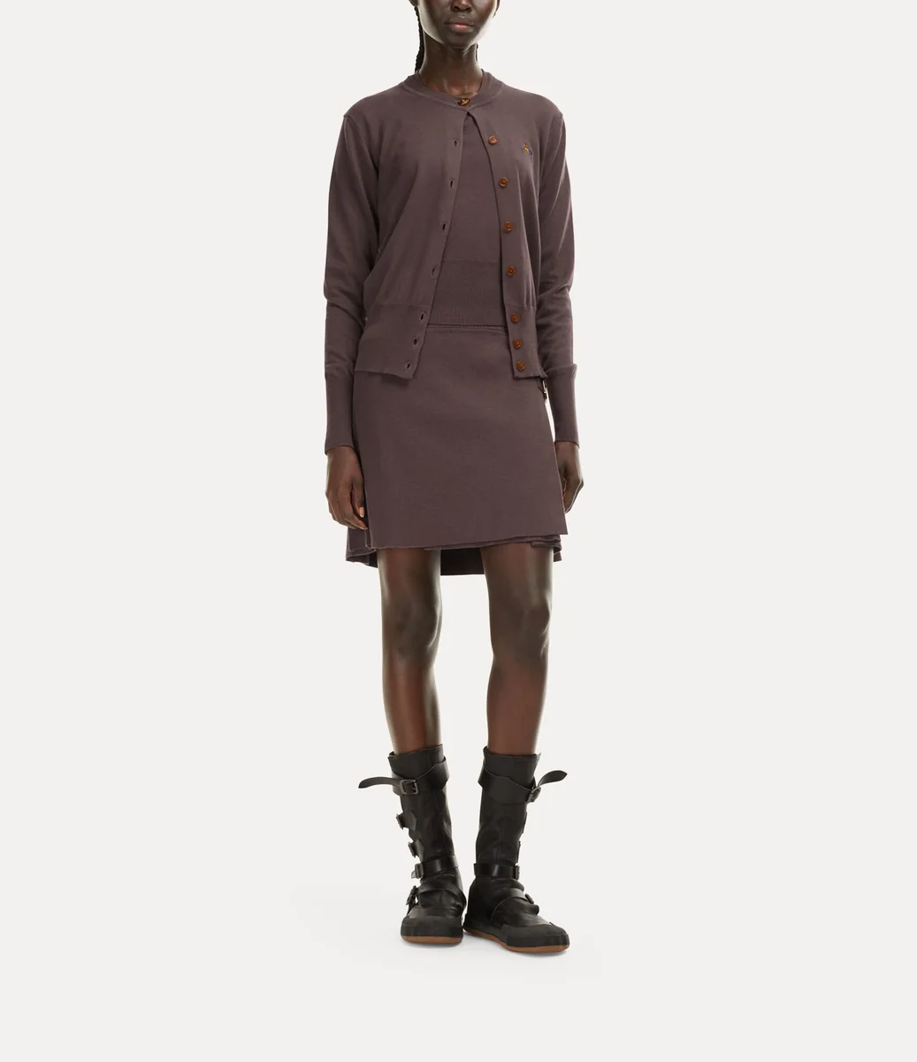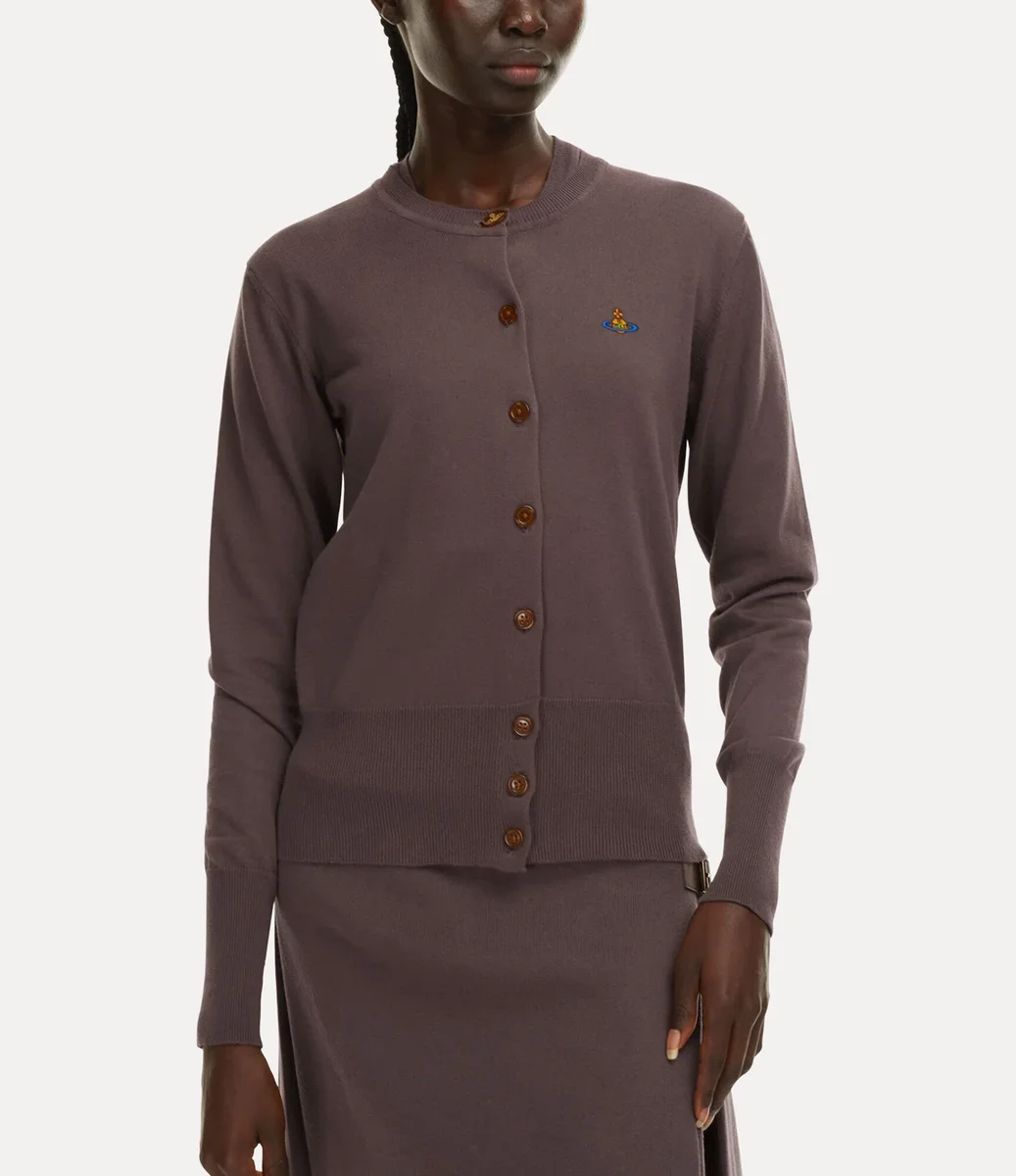 Vår Bea-kofta har en bomulls- och kashmirfinish, rund halsringning och en figurnära silhuett. Plagget är prydd med våra signaturknappar i bärnstensfärg och förhöjs av en broderad kula på bröstet, som symboliserar Viviennes vision om att föra traditionen in i framtiden.