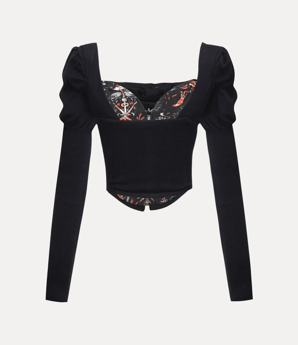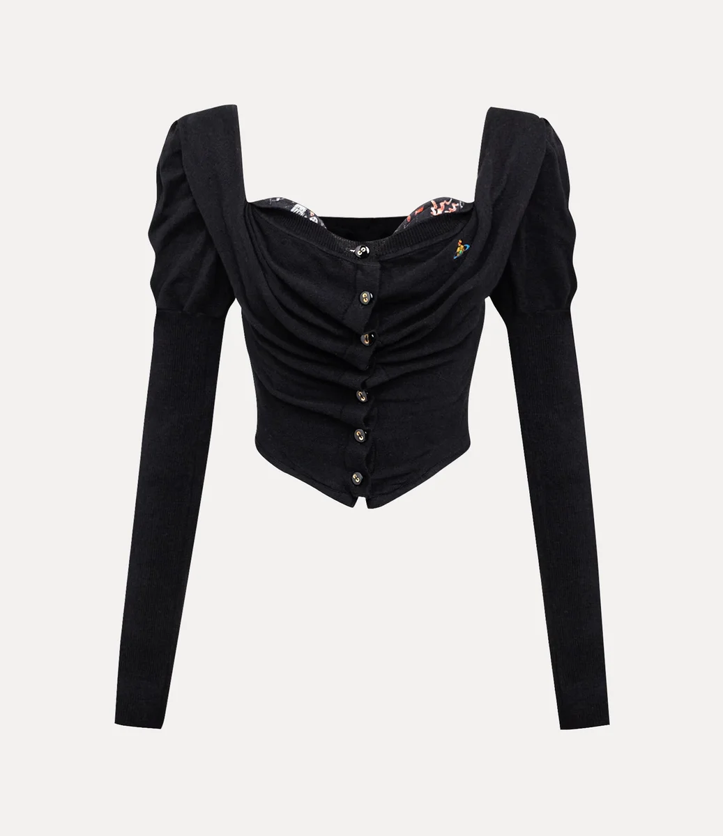 Vår Bea Corset-kofta är tillverkad av en mjuk bomulls- och kashmirblandning och knäpps med glänsande pärlemorknappar. Plagget har en kontrasterande korsettliknande design och elegant drapering vid halsringningen, och avslutas med intrikat puffade axlar för en skulptural silhuett.
