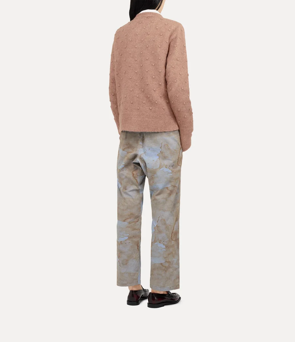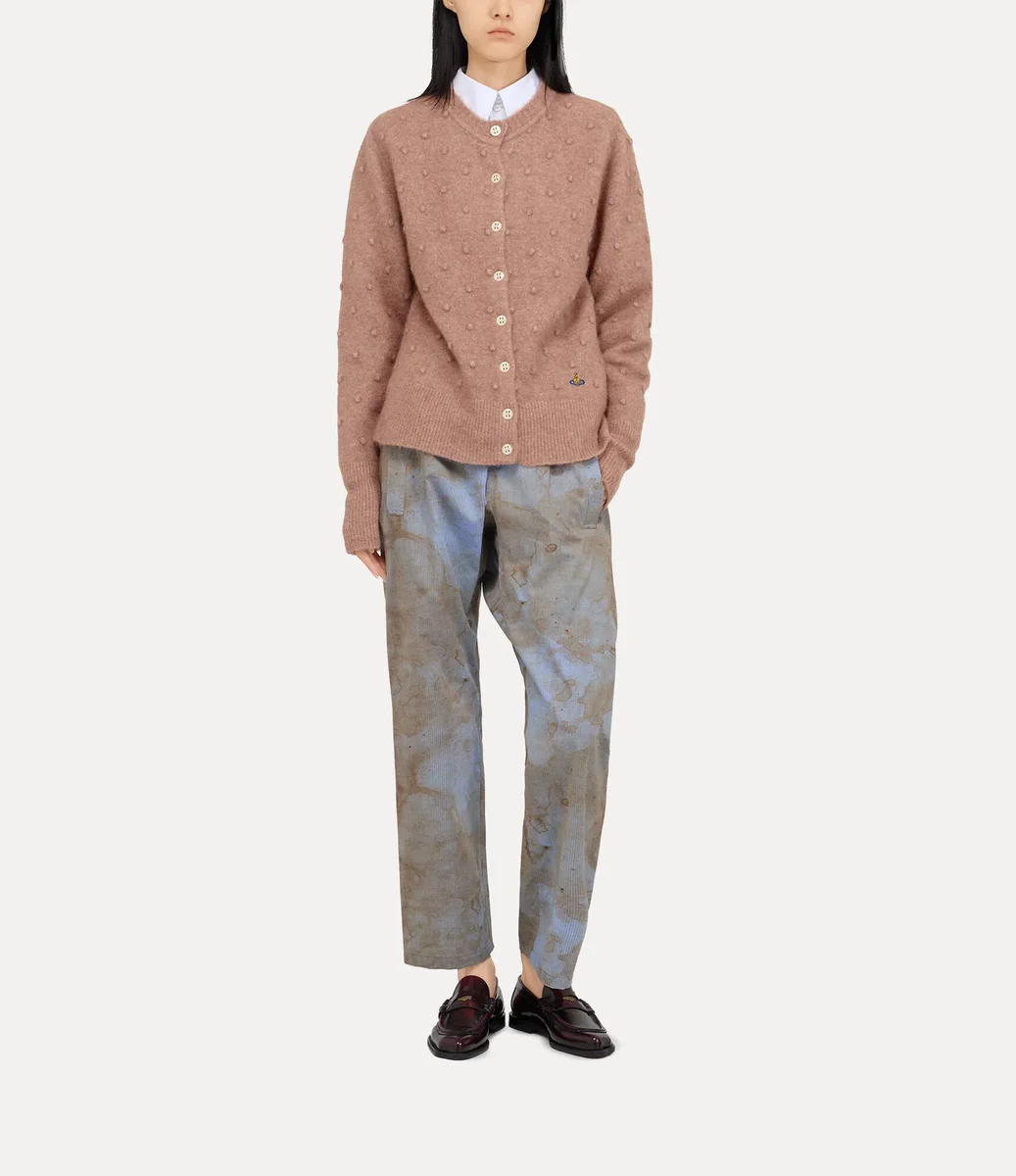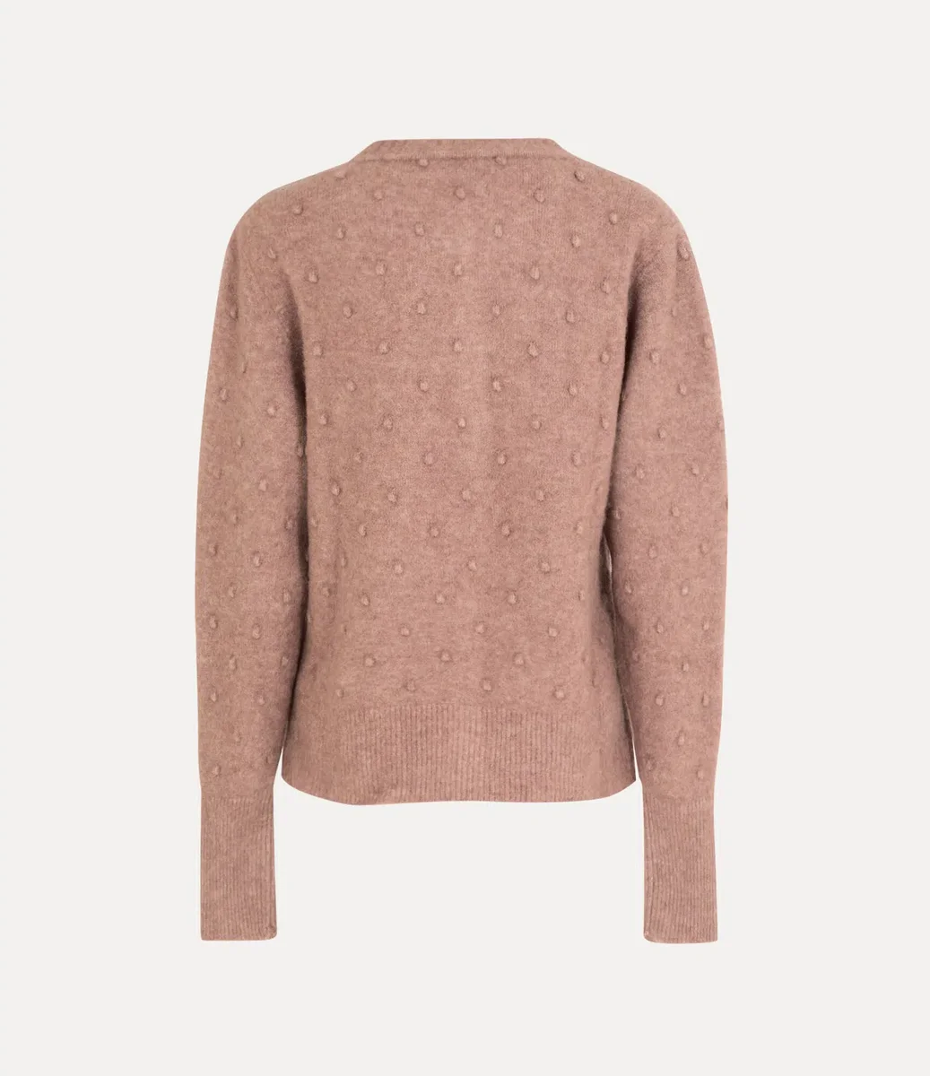 Rubina-kofta är tillverkad av en mjuk alpackaullblandning och har en lekfull bobble-stickad struktur över hela designen. Plagget har en klassisk rund halsringning med ribbade detaljer och är broderat med ett mångfärgat orb-logo nära fållen, som symboliserar tradition, omgiven av Saturnus himmelska ringar, som symboliserar framtiden.