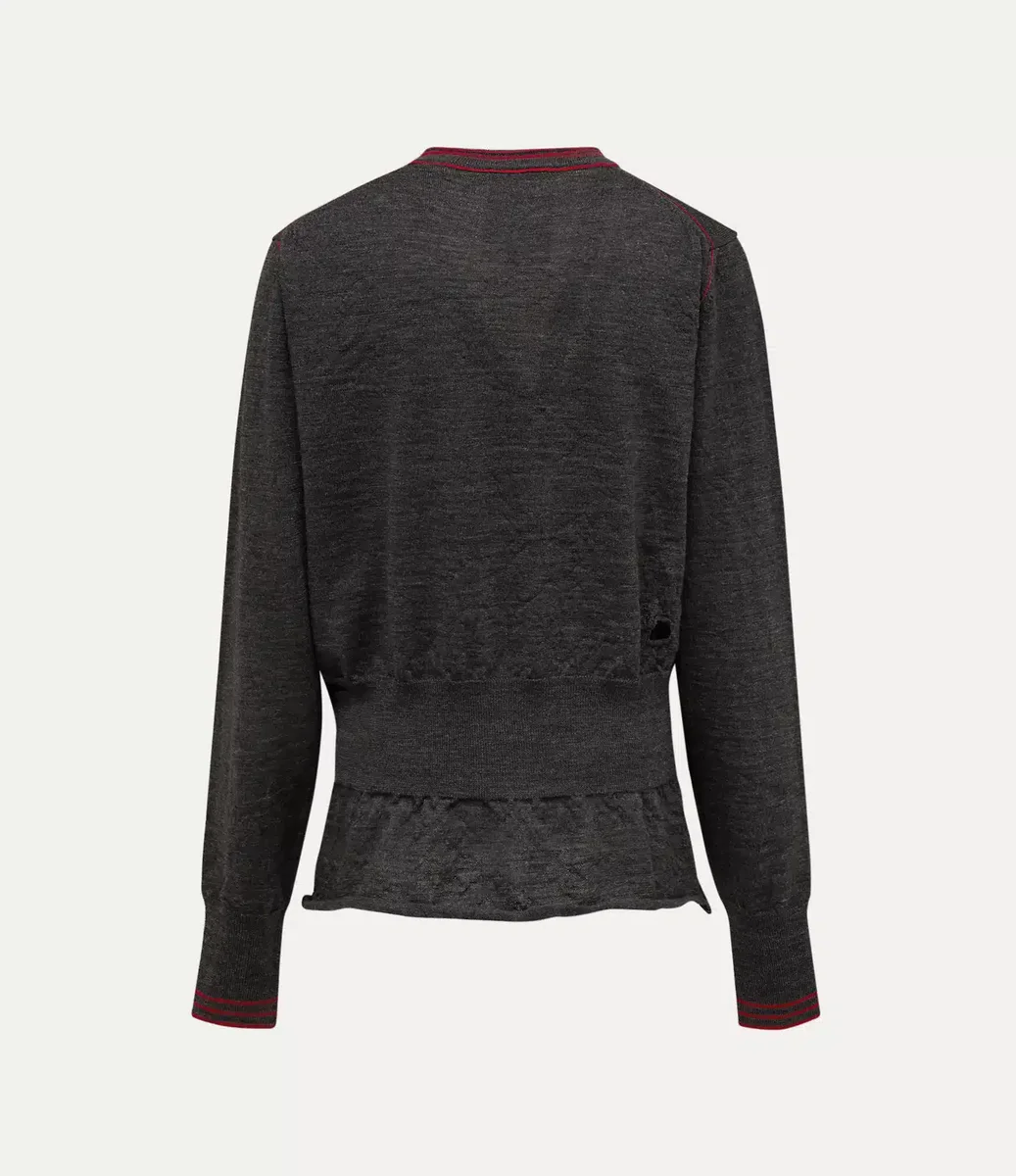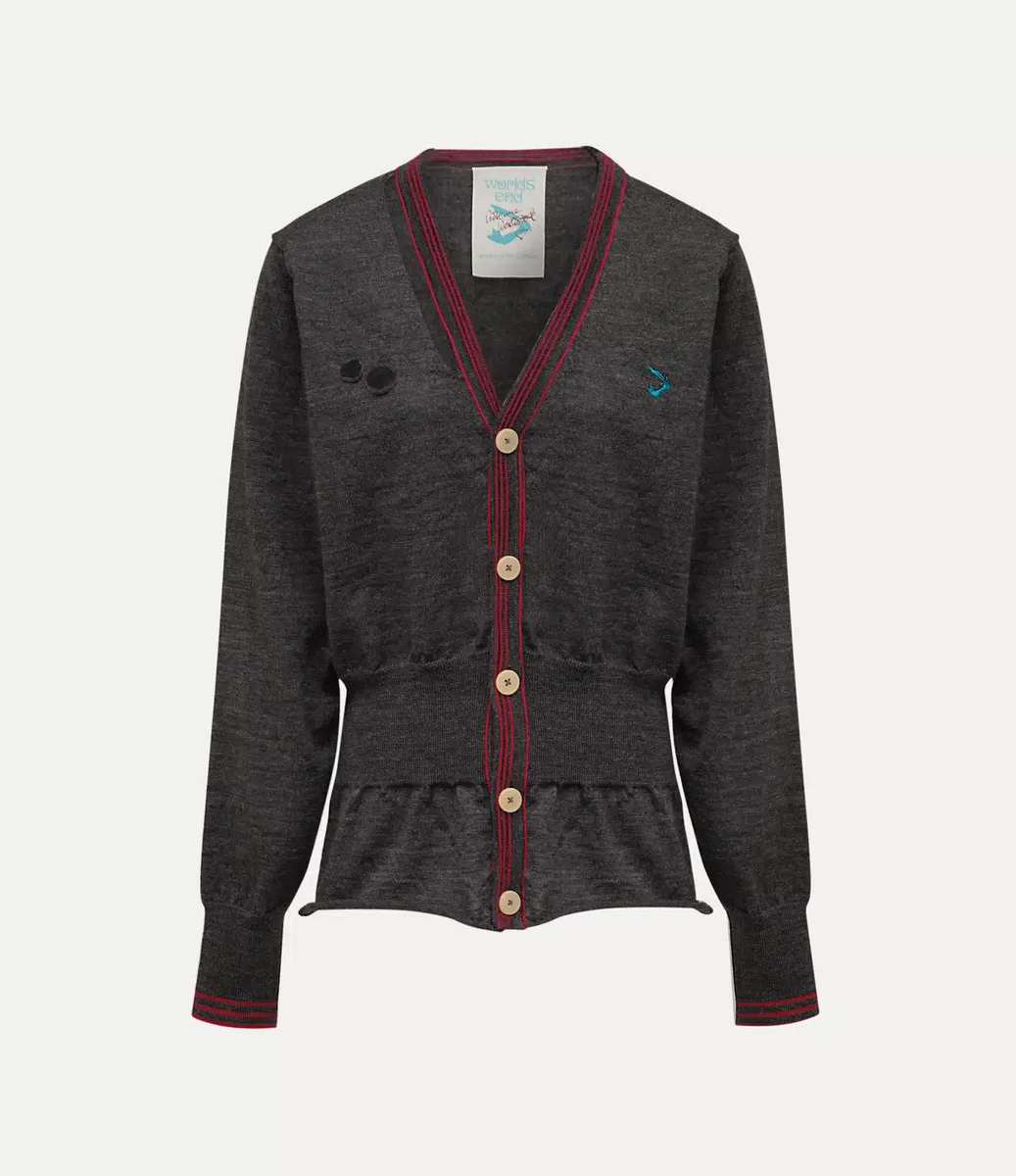 Vår Worlds End Chaos-kofta har knappar framtill och V-ringning, kompletterad med detaljerna ”Arm and Cutlass” på vänster bröst. Plagget har en rullad fåll och två snitt framtill, som anspelar på Viviennes ikoniska ”CHAOS”-kollektion och förkroppsligar hennes rebelliska anda och engagemang för att utmana politiska konventioner.