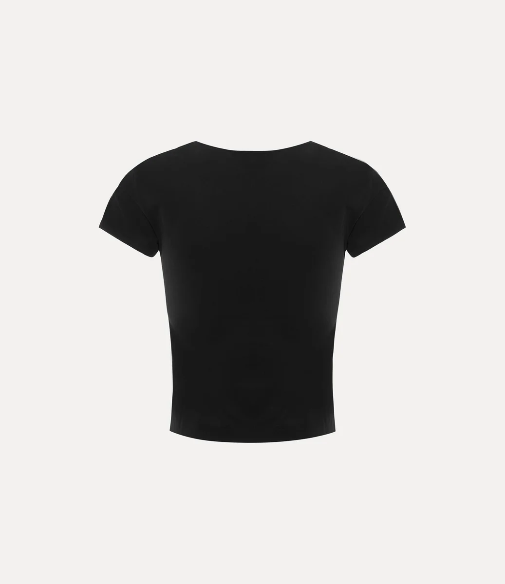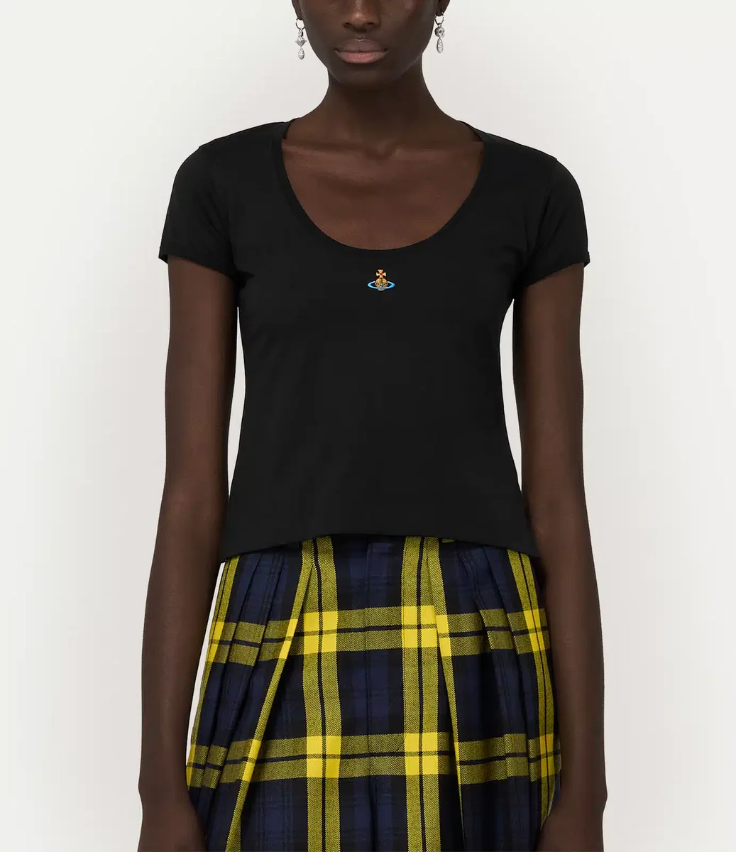 Vår Micro Lollo-t-shirt har en kortare silhuett i bomull, med korta ärmar och en låg rund halsringning. Plagget har ett broderat flerfärgat klot i mitten av bröstet, som symboliserar tradition, omgivet av Saturnus himmelska ringar, som representerar framtiden.