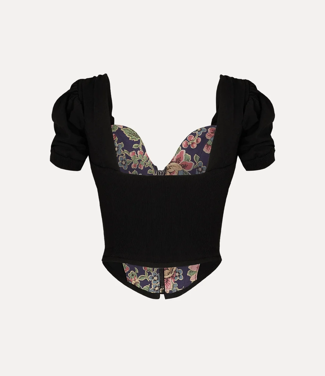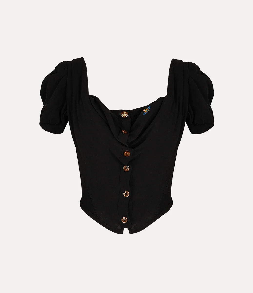 Bea Corset-kofta med korta ärmar har en delikat drapering vid halsringningen och axlarna, som faller i en strukturerad korsett med benstöd och knäpps med våra klassiska bärnstensfärgade knappar. Designen pryds av en broderad mångfärgad sfär på bröstet, som förkroppsligar Viviennes vision om att föra traditionen in i framtiden.