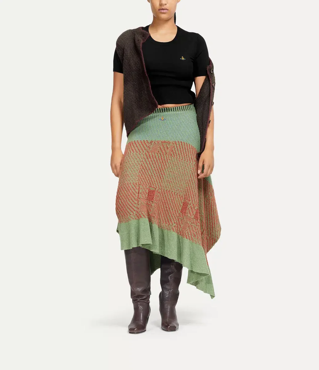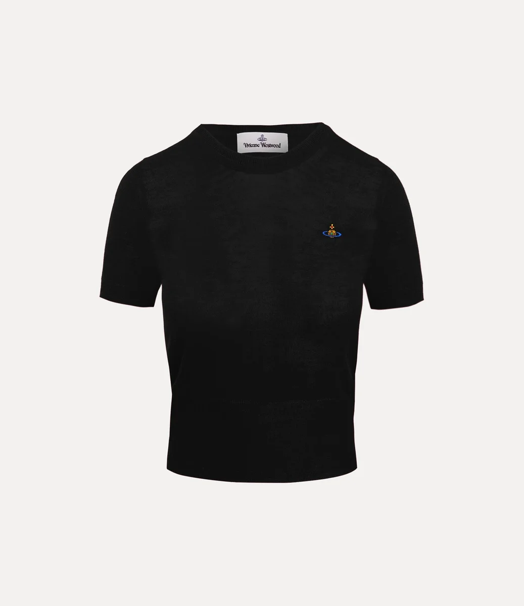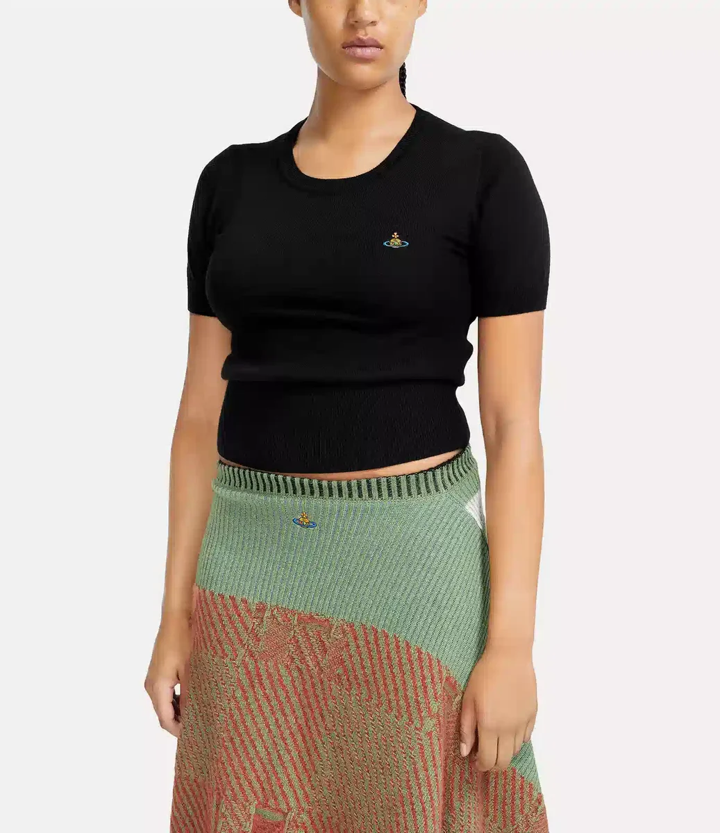 Vår Bea-top har fått en uppfräschning denna säsong. Denna kortärmade topp i bomullskashmir ingår i vår klassiska kollektion och har ribbade kanter och en broderad mångfärgad sfär på bröstet – synonymt med Viviennes vision om att föra traditionen in i framtiden.