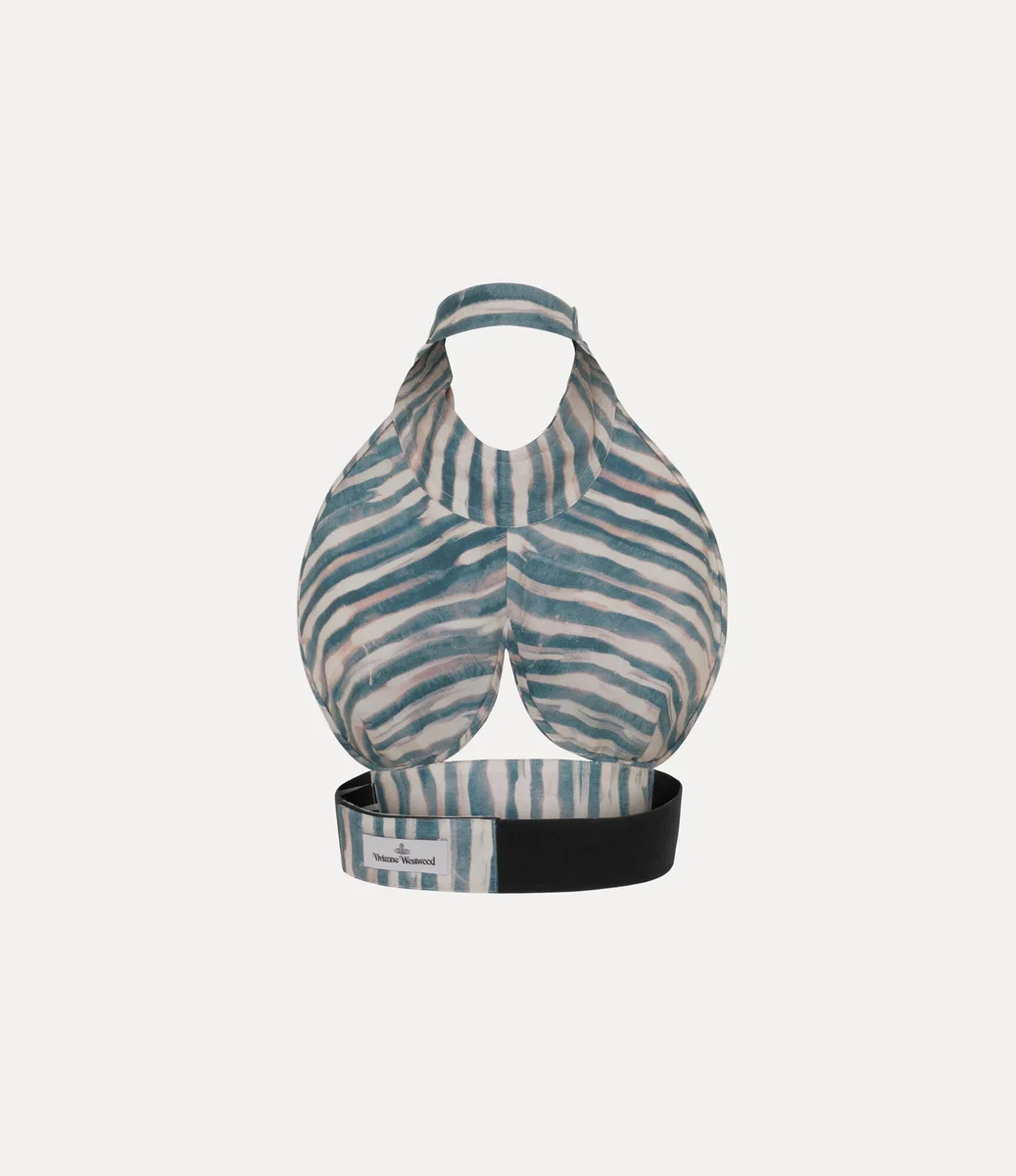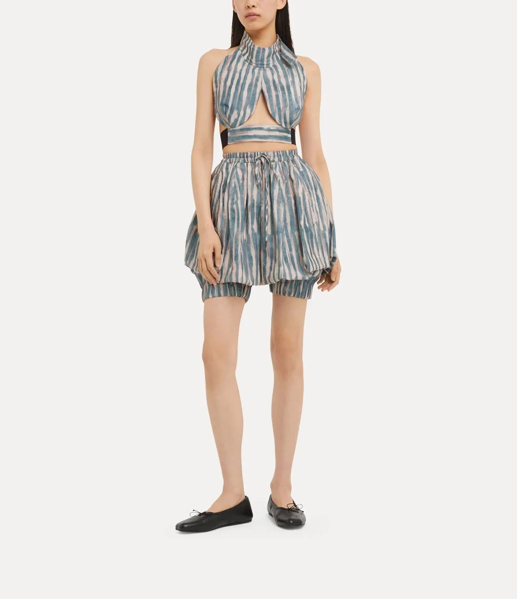 Den ärmlösa Boob-toppen är tillverkad av mjuk bomull och har en skulpterad passform som smidigt formar sig efter bröstet. Den höga halsringningen och den korta modellen skapar en smickrande silhuett, medan de handmålade penseldragen och den överfärgade ytan ger plagget ett unikt, strukturerat utseende.