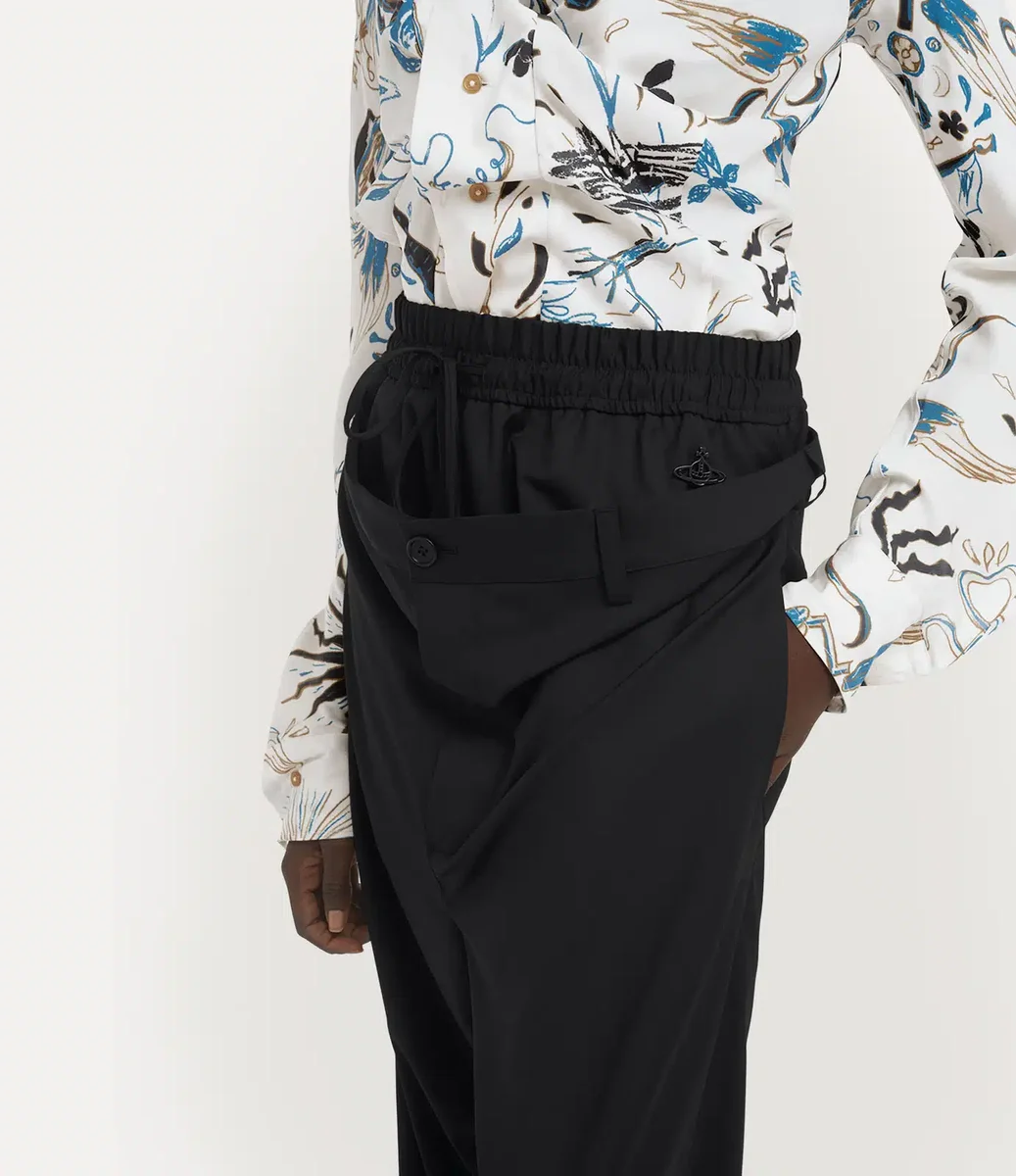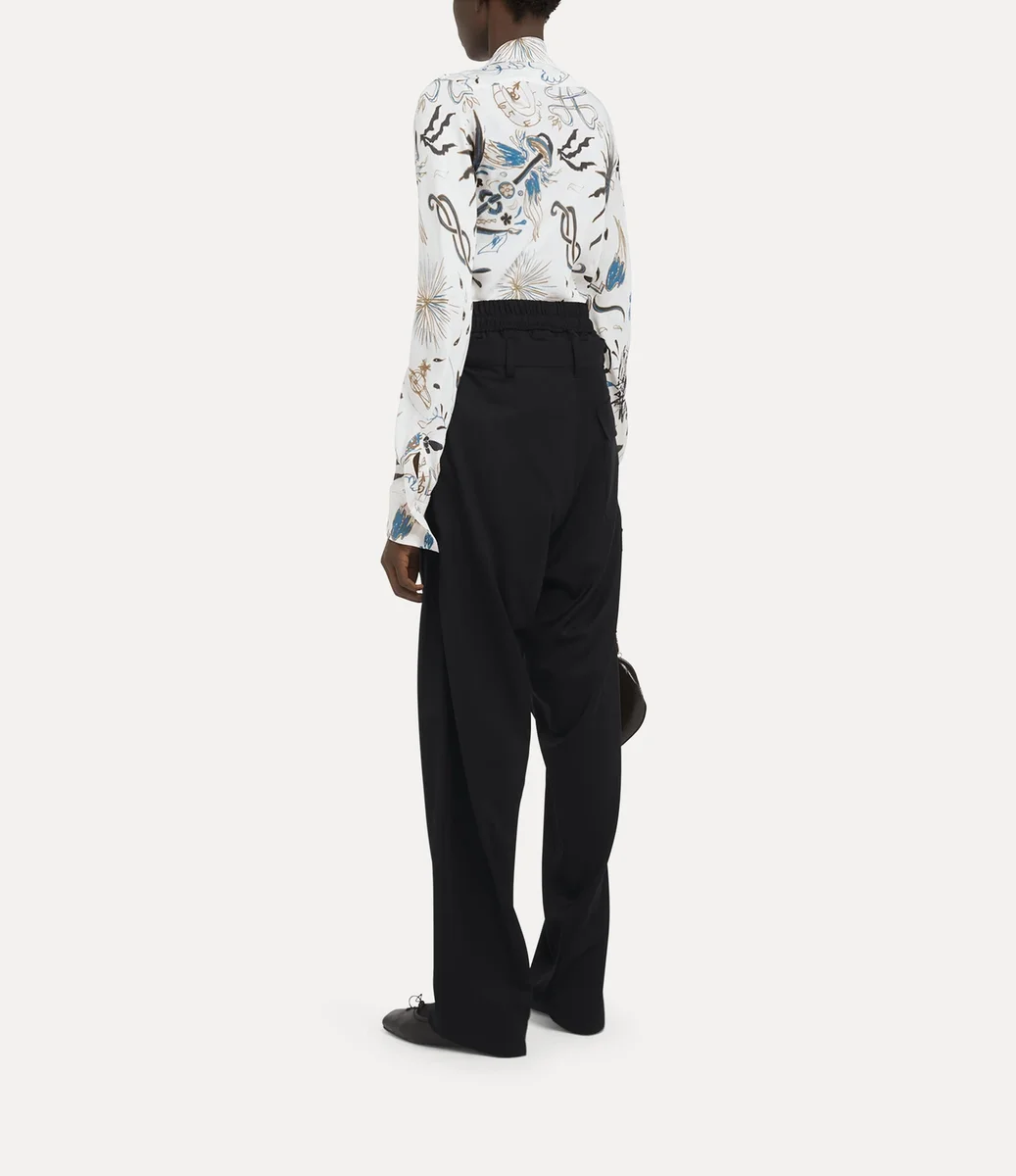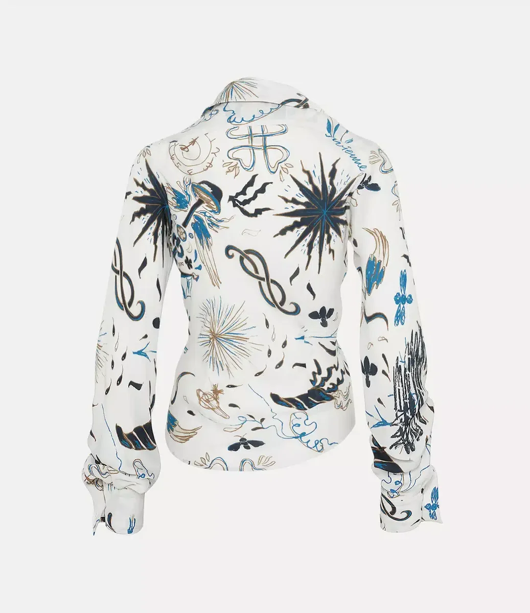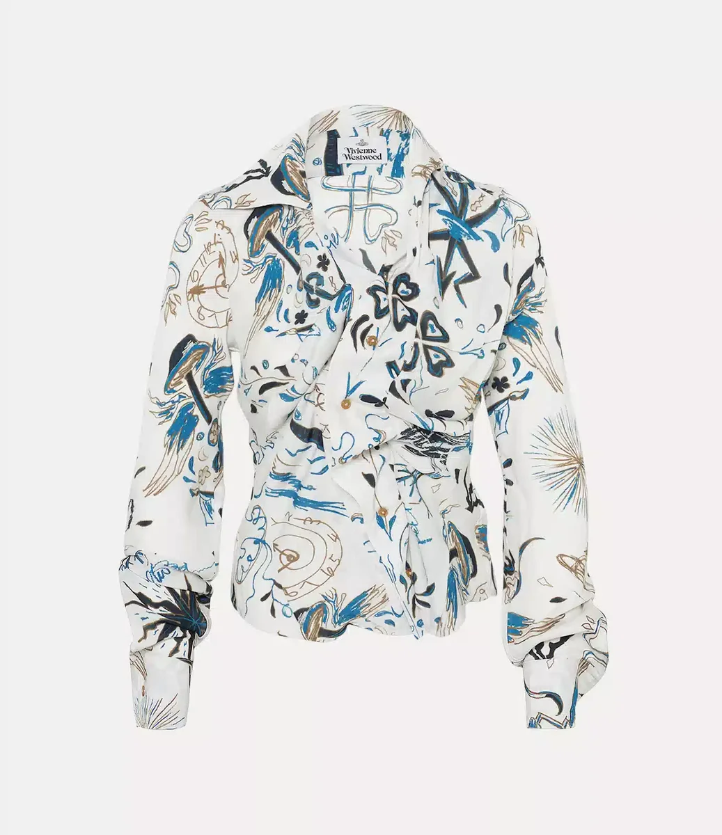 Vår Drunken-skjorta är designad med Viviennes experimentella drunken tailoring-system och har en excentrisk knäppning och asymmetrisk fåll. Inspirerad av Frans Hals målning ”The Laughing Cavalier” är plagget tryckt med ett abstrakt grafiskt mönster som innehåller husets signaturikonografi.