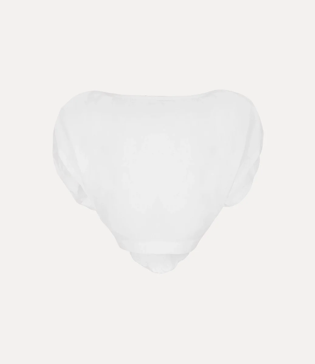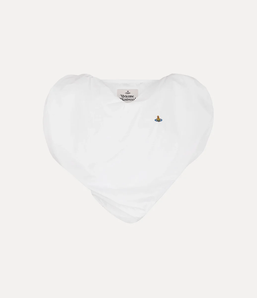 Den asymmetriska hjärtformen har blivit ett signum för modehuset och har dykt upp i många kollektioner genom åren. Den här säsongens Heart-top återupplivar silhuetten, som Vivienne använde för att väcka kärlek till både mänskligheten och planeten, komplett med en broderad sfär på vänster sida av designen.