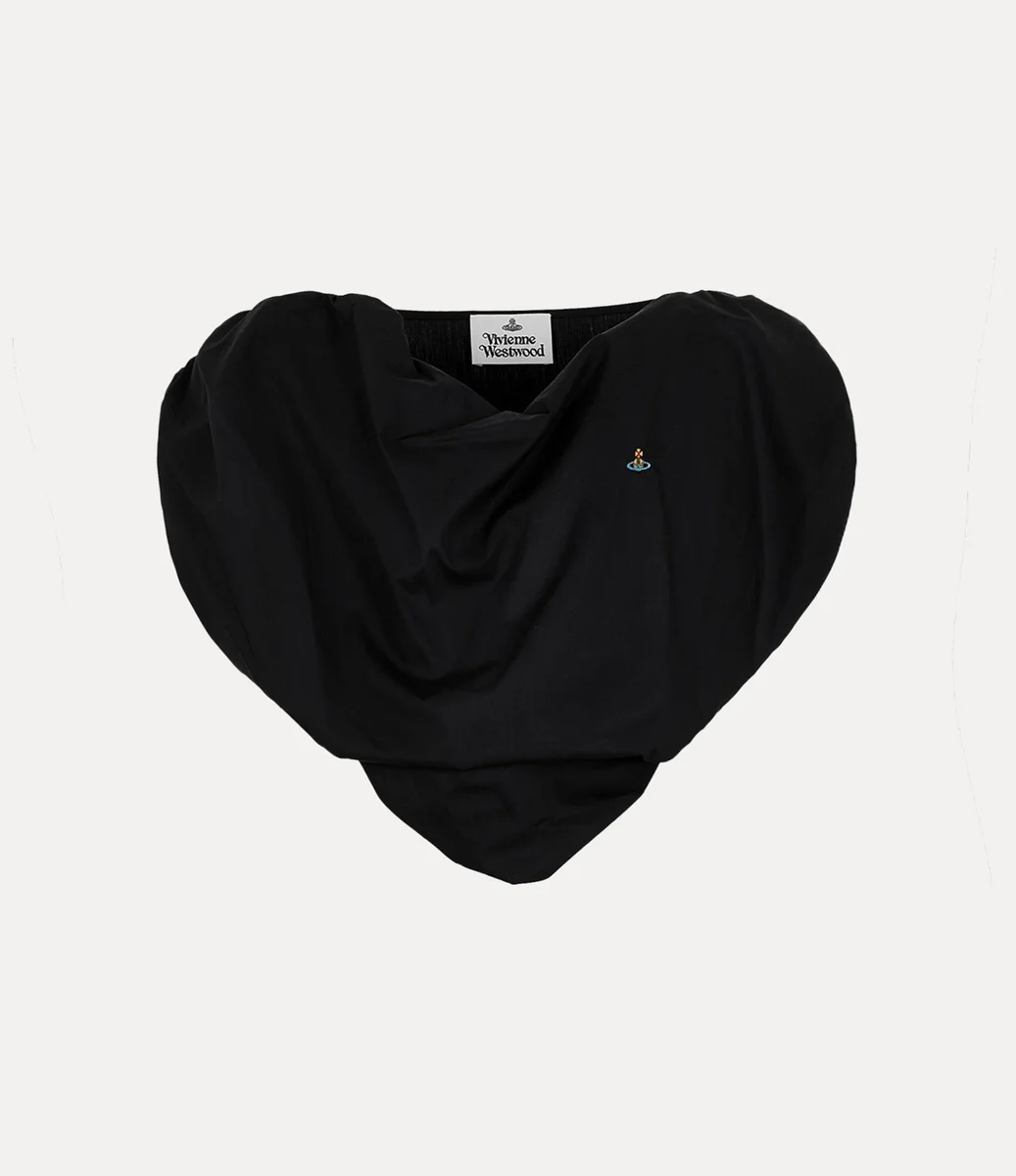 Den asymmetriska hjärtformen har blivit ett signum för modehuset och har dykt upp i många kollektioner genom åren. Den här säsongens Heart Top återupplivar silhuetten som Vivienne använde för att väcka kärlek till både mänskligheten och planeten, komplett med en broderad glob på vänster sida av designen.