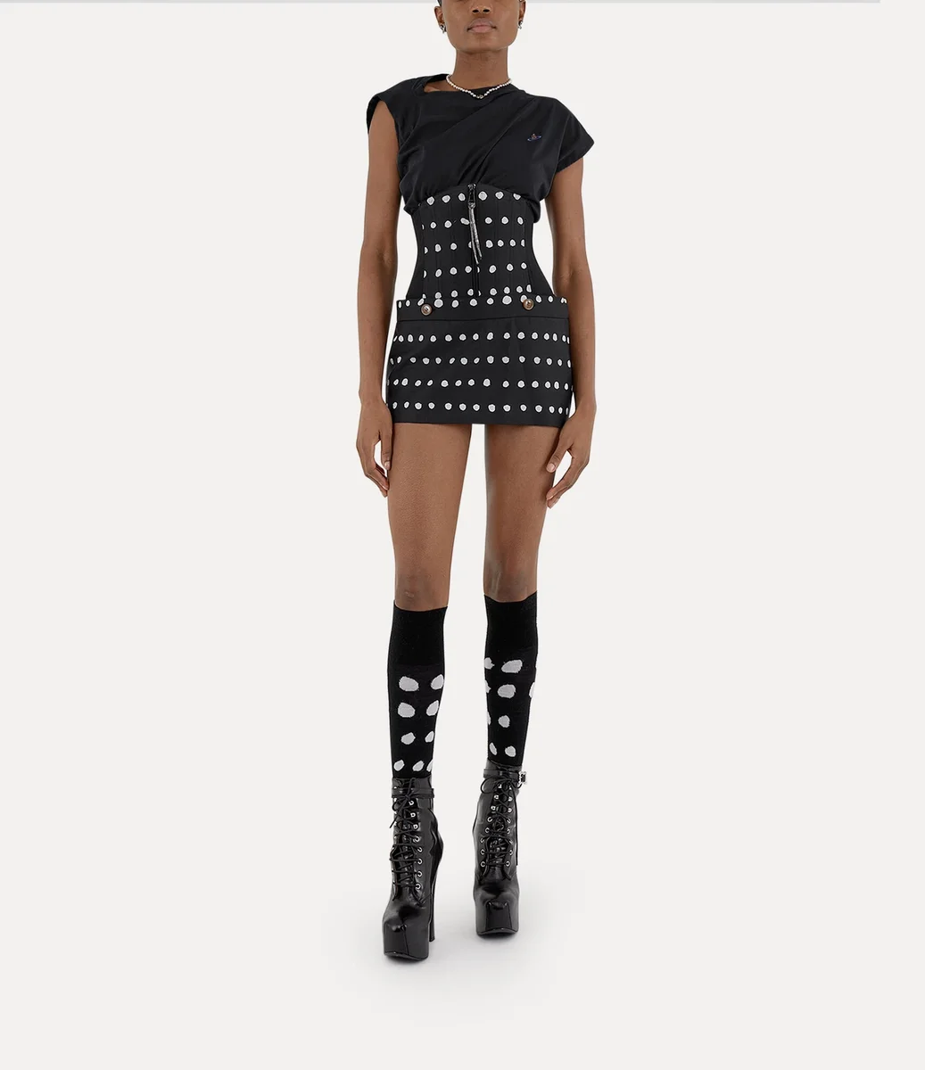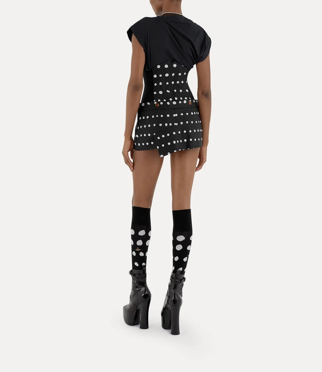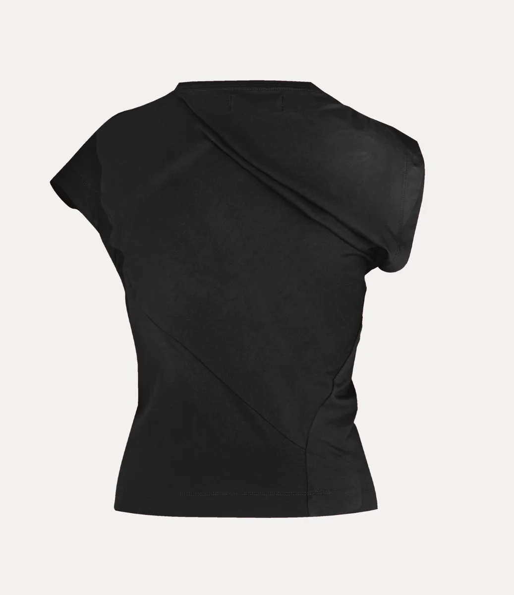 Husets signaturplagg Hebo-toppen har uppdaterats och har denna säsong en mjuk bomullsfinish och en broderad sfär på vänster sida av bröstet – synonymt med Viviennes vision om att föra traditionen in i framtiden. Silhuetten har Viviennes signaturhalsringning inspirerad av snitt, draperade detaljer och vridet tyg på baksidan.