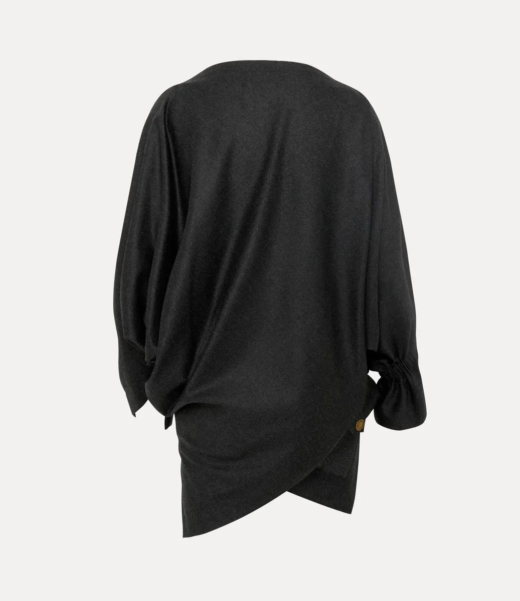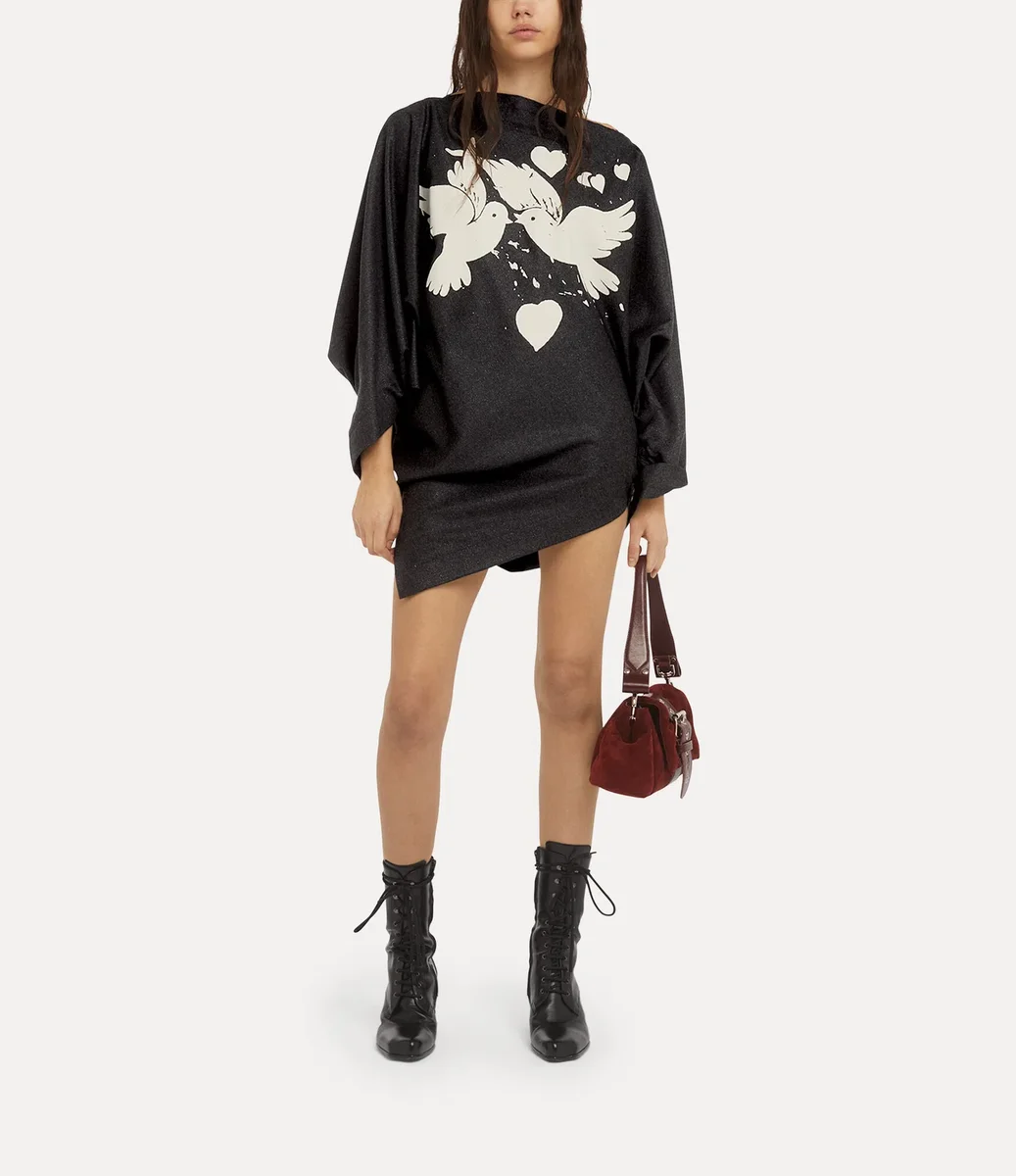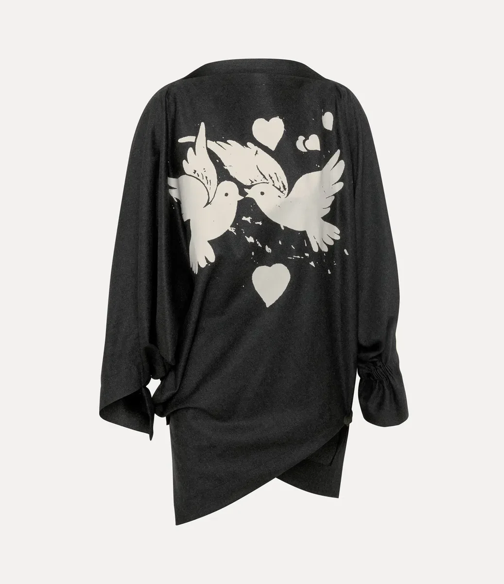 Vår Infinity-top är tillverkad av metalliskt borstad ull och prydd med motivet ”Dove and Heart”. Den har långa ärmar som är rynkade vid handlederna, en bred båthalsringning och nedhasade axlar, vilket ger en oversized silhuett som avslutas med en asymmetrisk fåll.