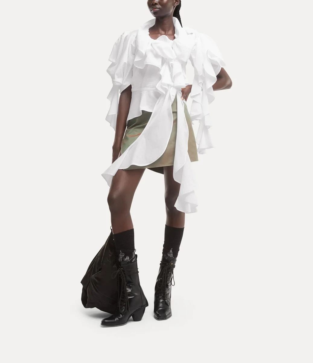 Vår Lola Ruffle-top faller över kroppen med avsiktlig asymmetri för att skapa en voluminös silhuett, avslutad med husets signaturmotiv, en rosett, som faller i svepande volangdetaljer. Plagget är insvängt i midjan och har en romantisk halsringning och mjukt puffade ärmar.