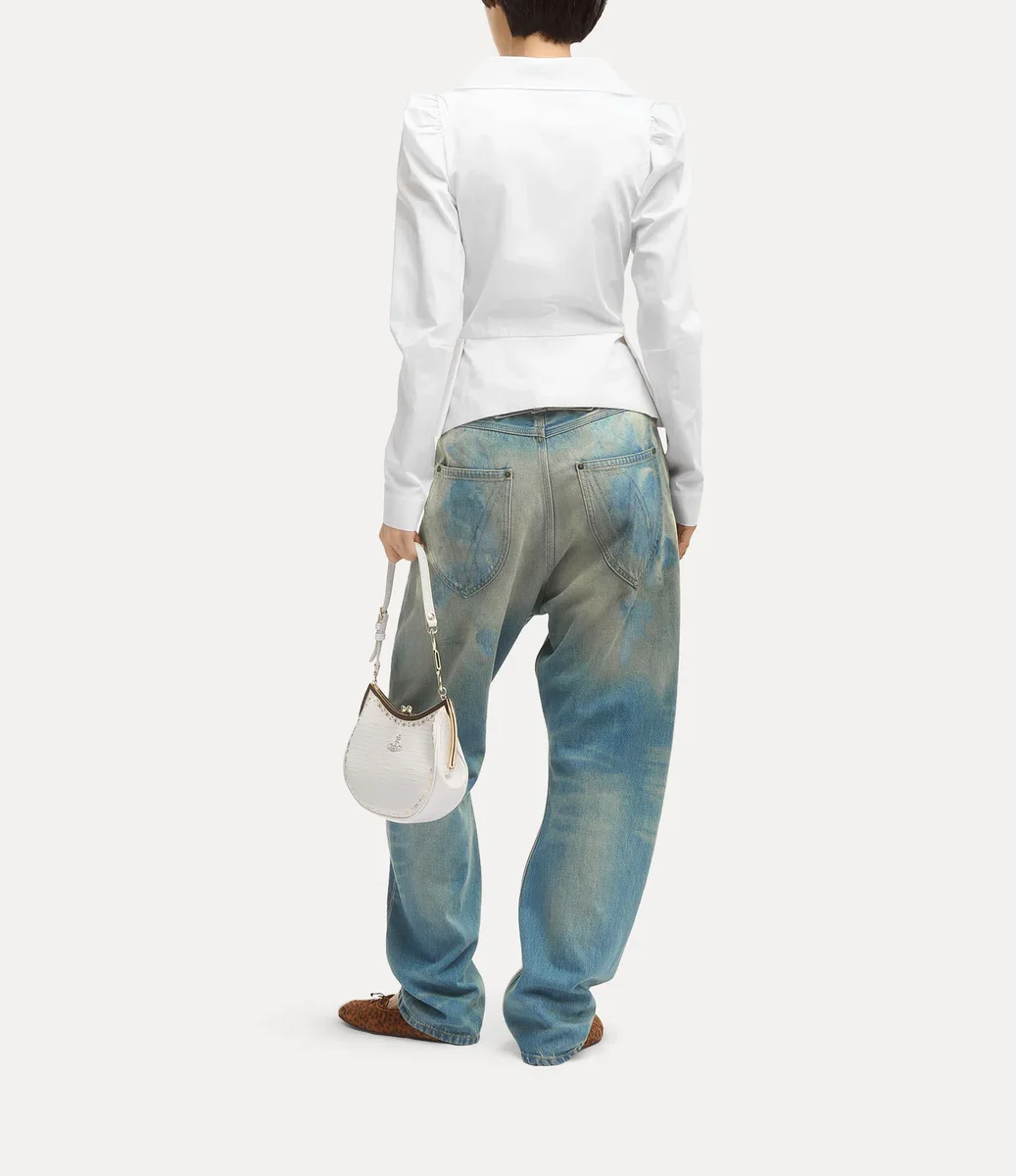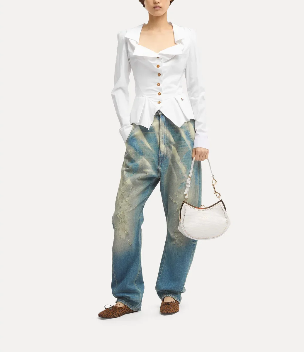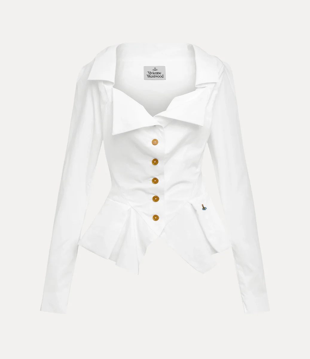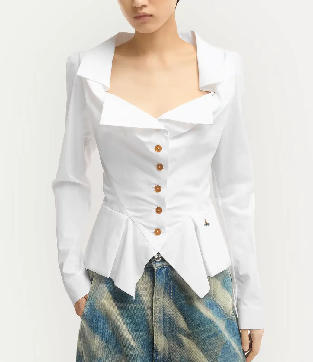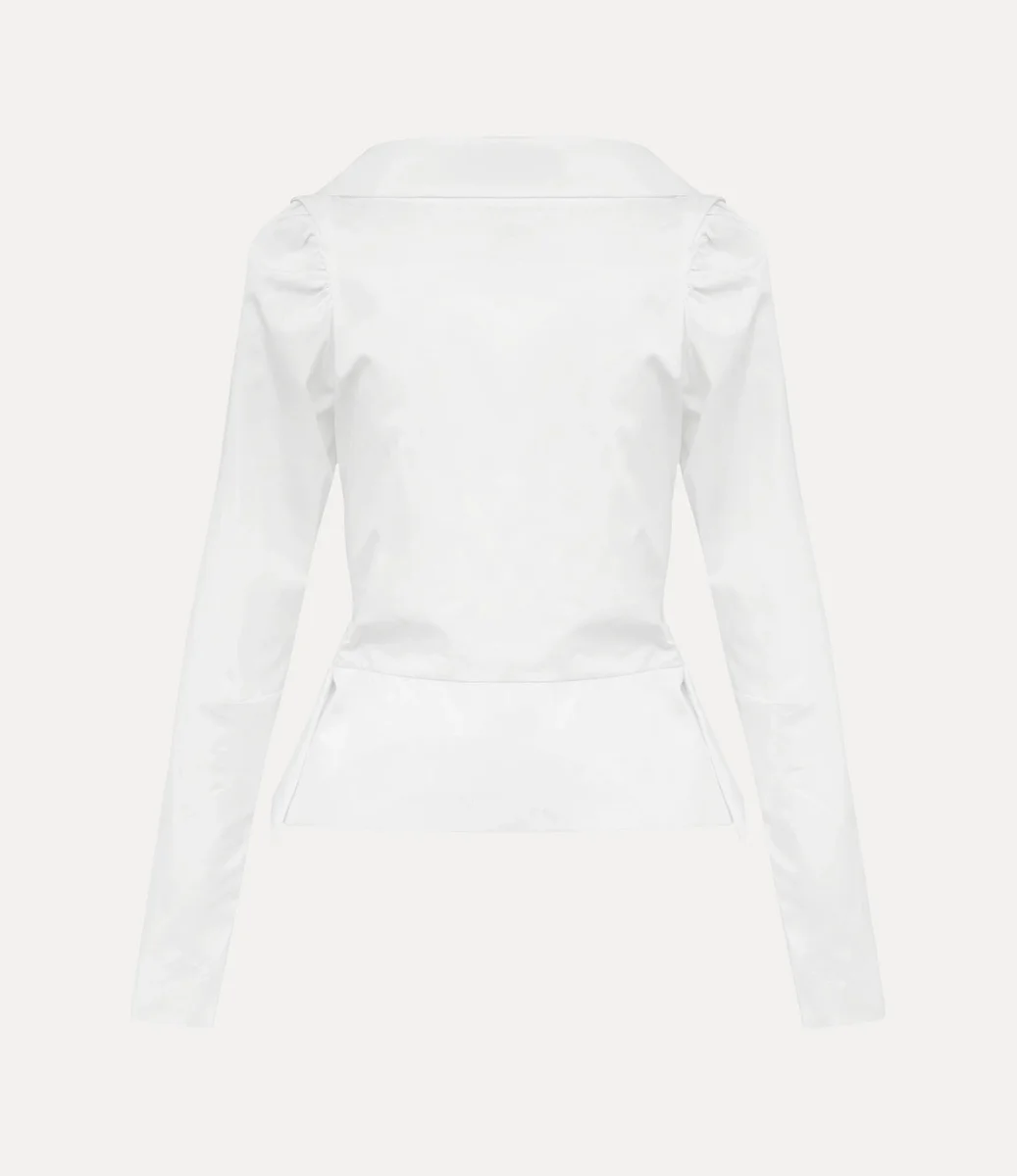 Monday-skjortan har origamiliknande veck runt halsringningen, knappar framtill och vårt signaturbroderi med mångfärgade kulor på höften. Plagget skapar en silhuett inspirerad av 1930-talets amerikanska Mellanvästern, med en figursydd överdel med utsvängd, veckad tygförlängning i midjan och elegant puffade axlar.