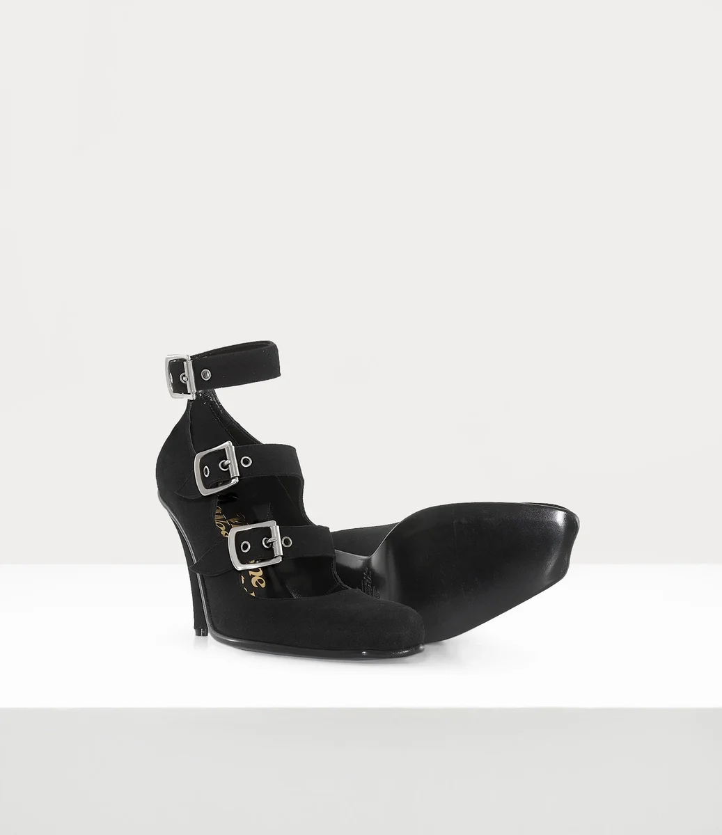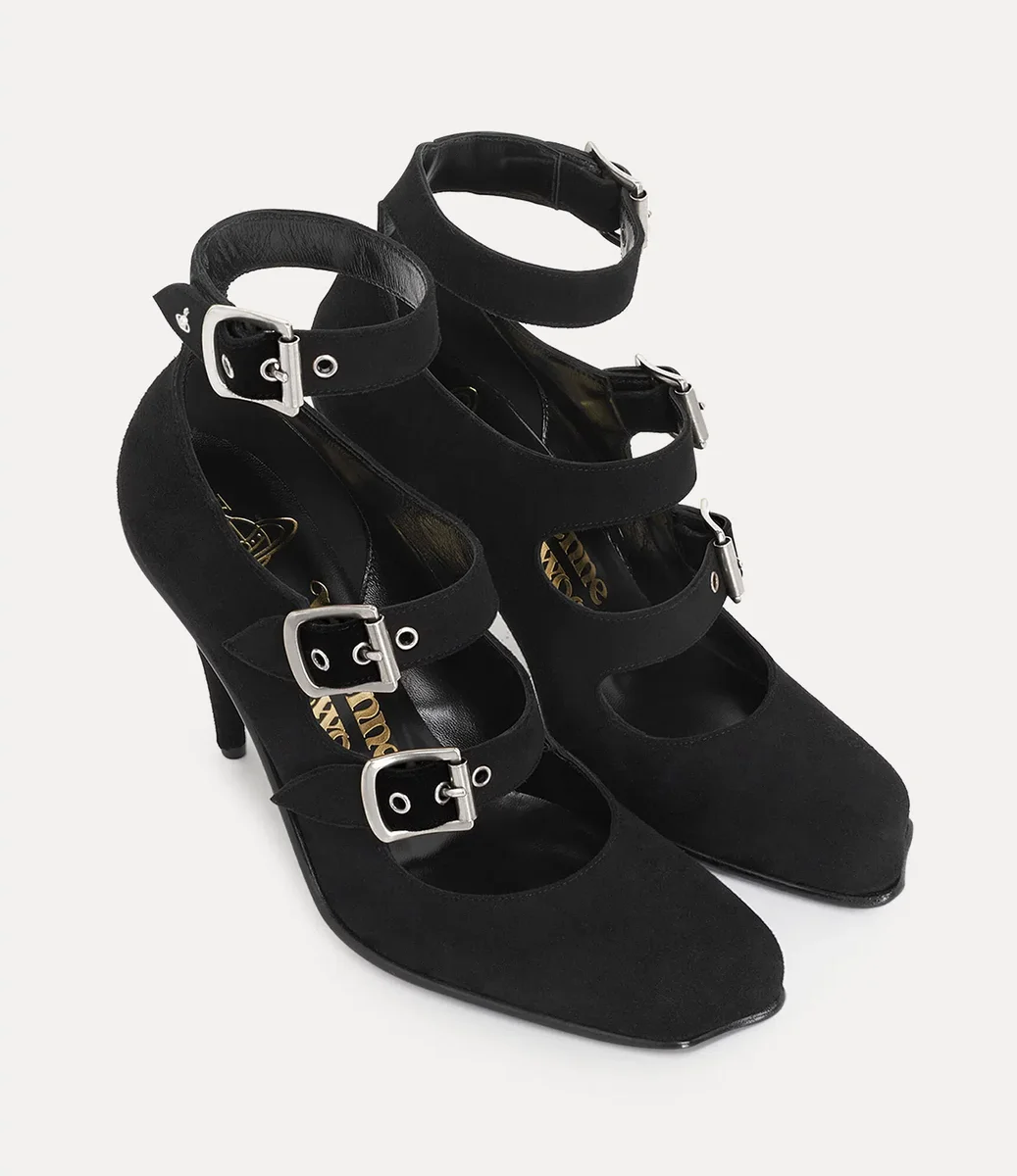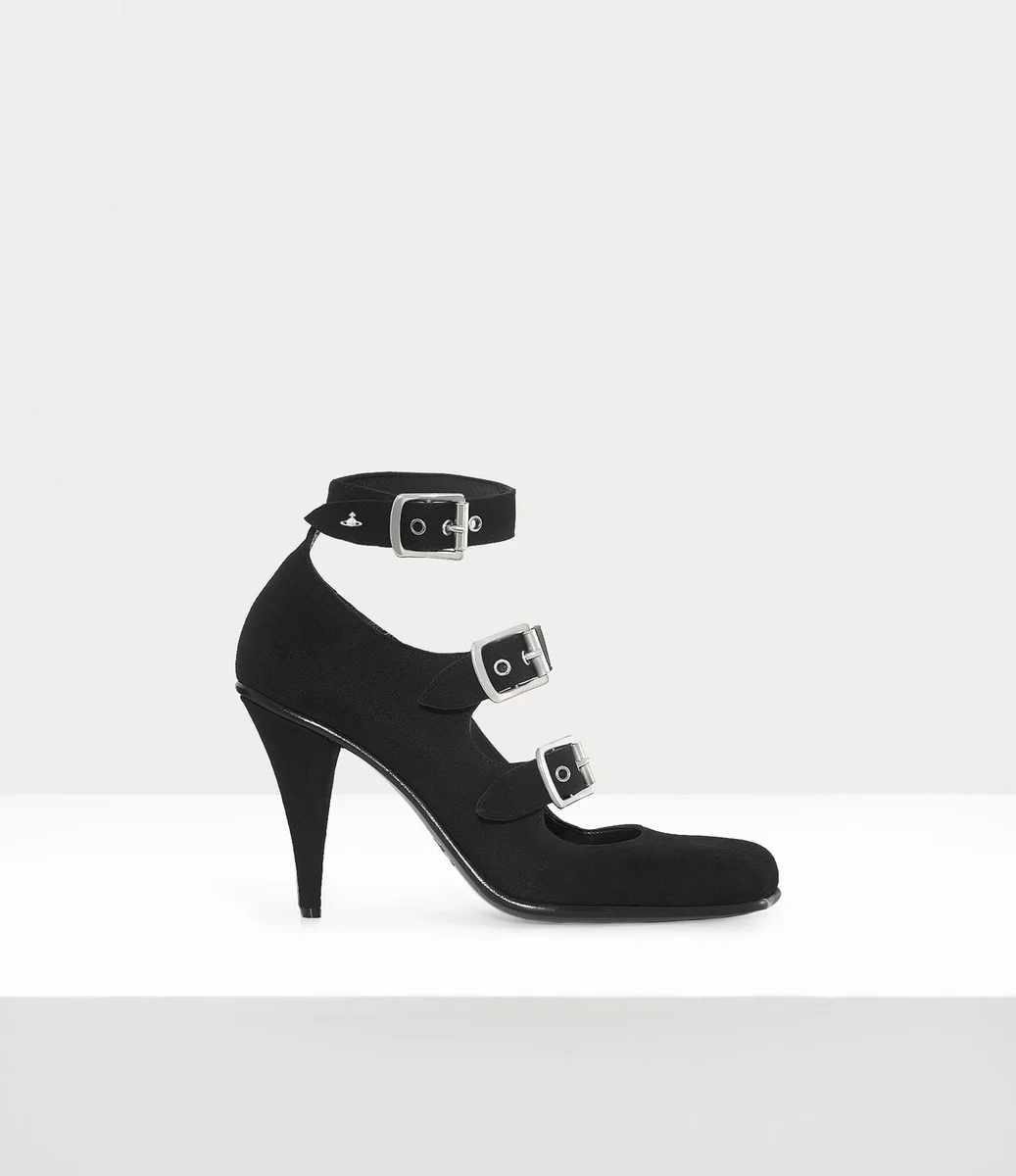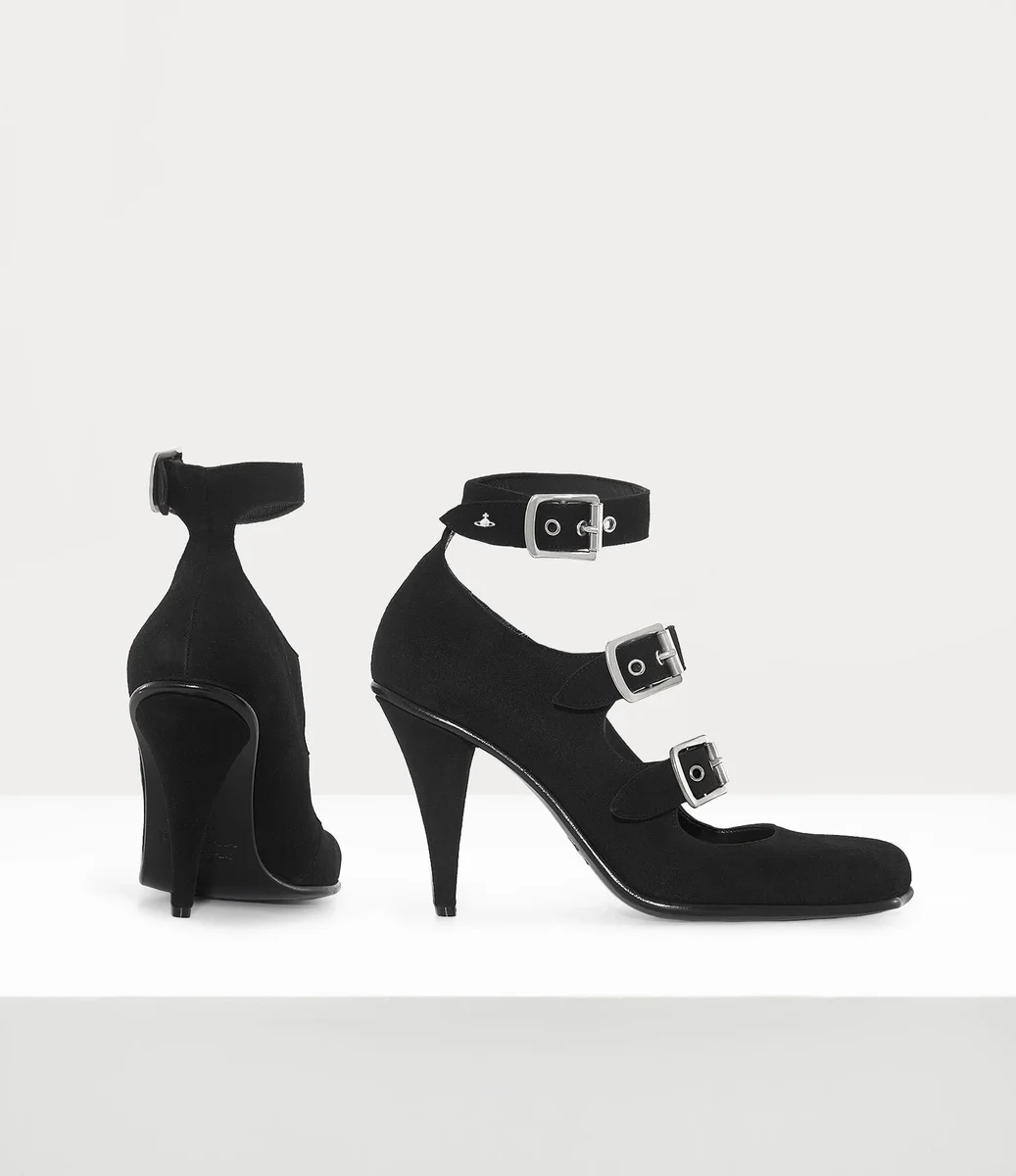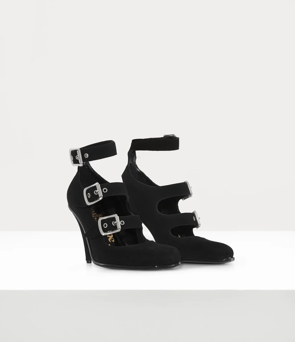 Våra Savage-klackar har en anatomisk silhuett inspirerad av husets ikoniska ”Animal Toe”-motiv, som först introducerades i vår-sommarkollektionen 2000, ”Summertime”. Designen är tillverkad av mocka och kompletteras med eleganta silverfärgade detaljer och ett miniatyrmotiv på remmen.