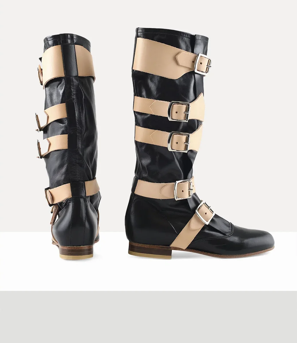 Våra Pirate-stövlar presenterades för första gången i höst-vinterkollektionen 1981, som influerades av Viviennes intresse för äventyrliga pirathistorier från 1600- och 1700-talet. Designen fångar essensen av romantik och rebelliskhet som ofta förknippas med pirater, med ett omslutande, mjukt, slapp läderben och tunga läderremmar med rullspännen som ger stövlarna ett robust, slitet utseende.