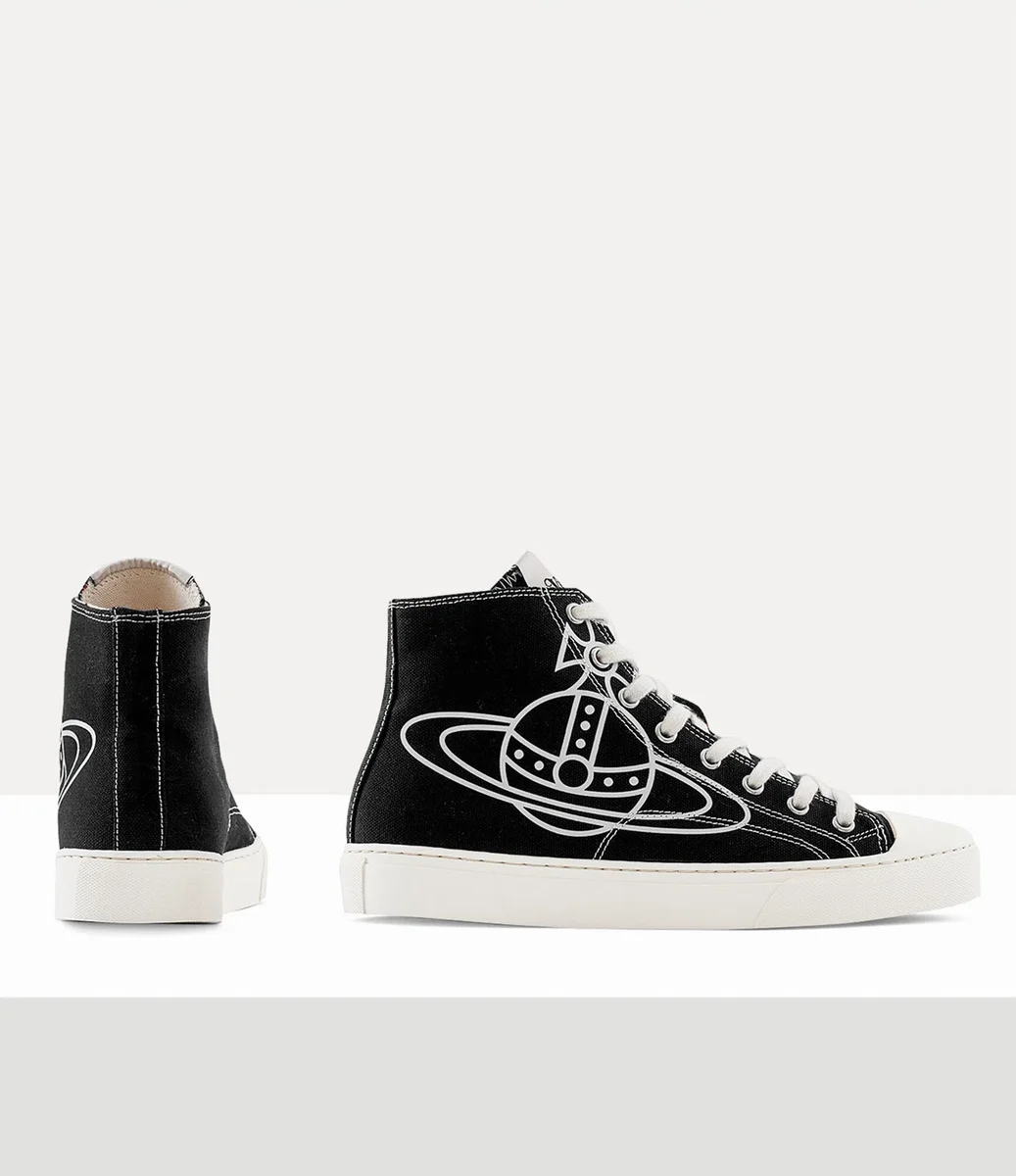 Våra höga canvasplimsolls har husets arkivmotiv ”Line Orb” över hela designen – synonymt med Viviennes vision om att föra traditionen in i framtiden. Modellen har en yta i bomullscanvas och är prydd med en vävd etikett på tungan.