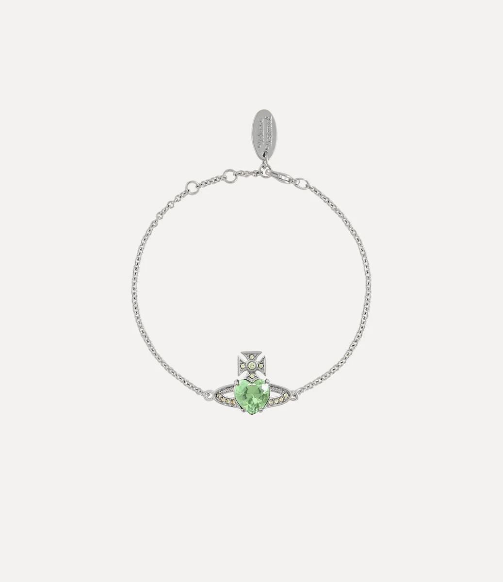 Vivienne Westwood Ariella-armbandet har en ljusgrön, hjärtformad kristall i mitten, tillverkad med polerad silverplätering.
