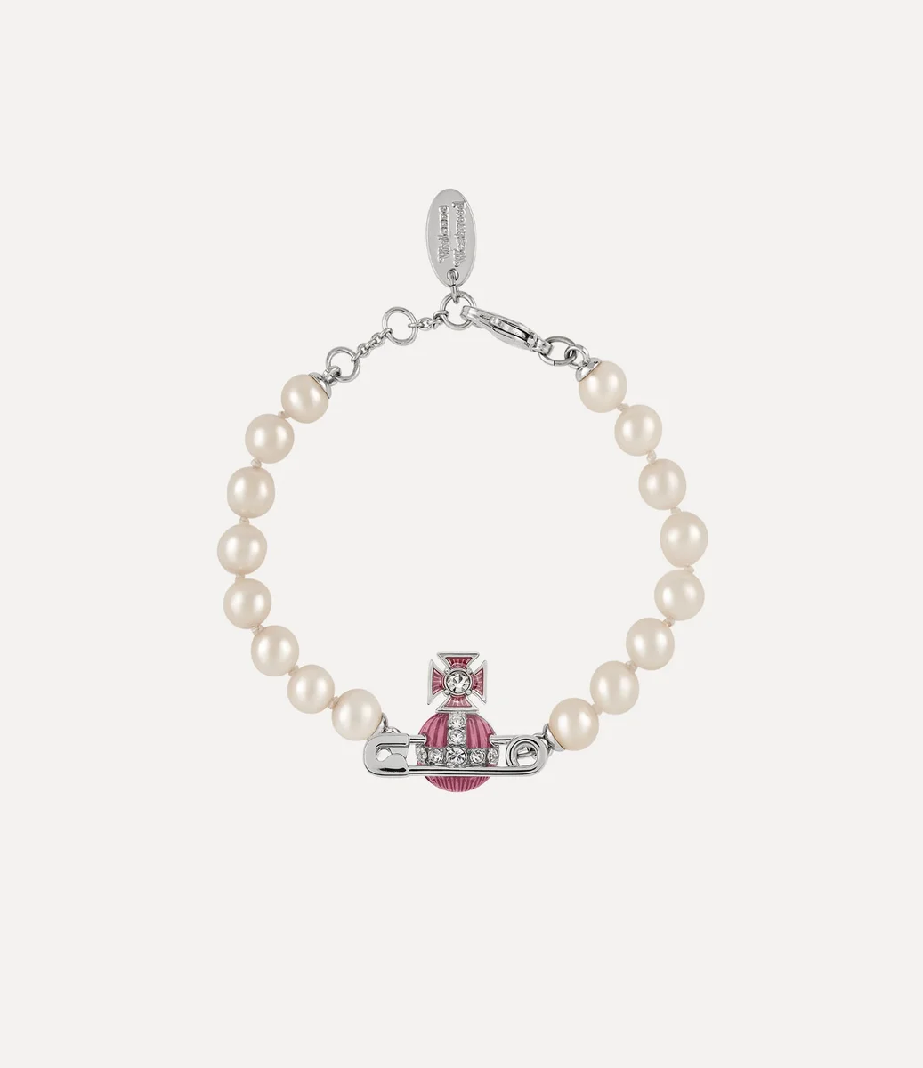 Kitty Pearl-armbandet har handknutna glas pärlor inspirerade av Vivienne Westwoods 1990 års ”Portrait”-kollektion. Den ikoniska sfäriska silhuetten är prydd med ett säkerhetsnålsmotiv, handmålat med genomskinlig rosfärgad emalj som avslöjar ett intrikat metallmönster under.