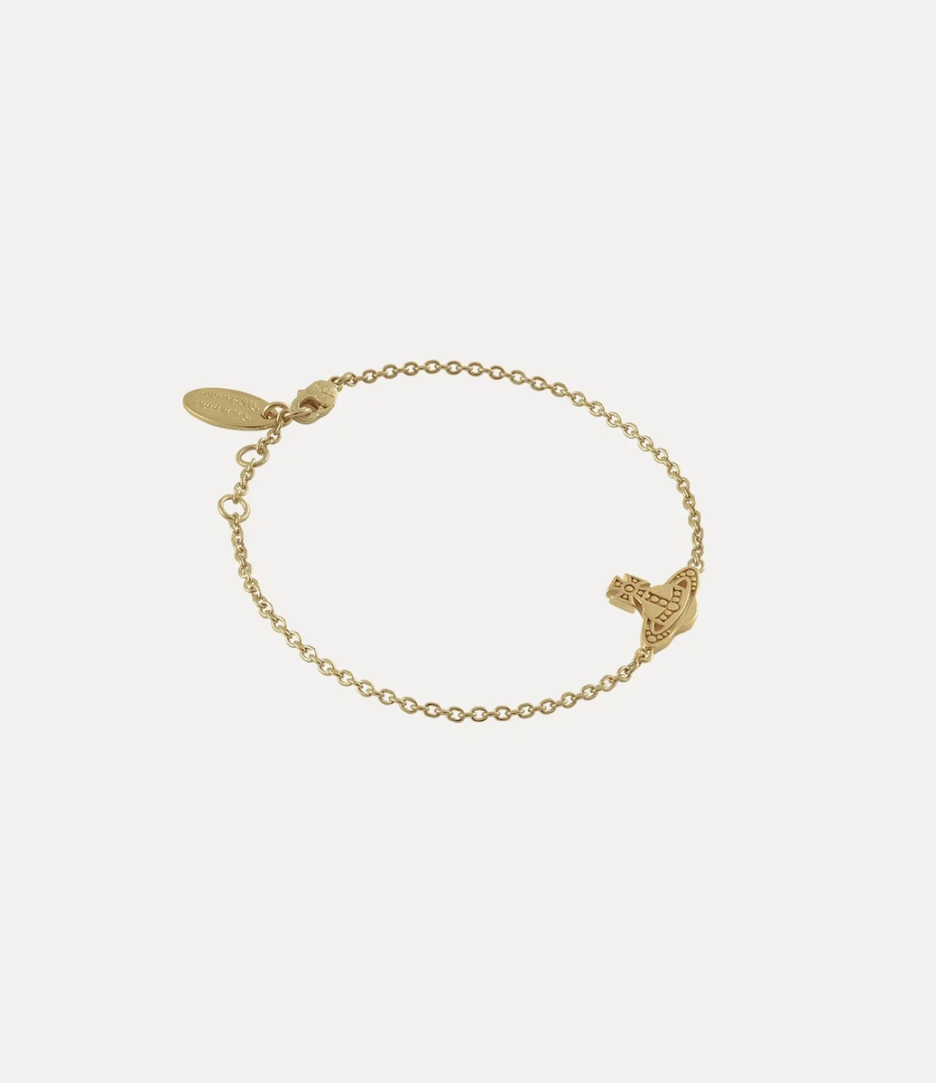 Vårt Marinetta-armband är tillverkat av guldfärgad metall och har ett centralt motiv med husets signaturorb. Designen har en mjukt pressad, pärlliknande struktur som ger ett handgjort utseende, medan graverade detaljer accentuerar konturerna på korset och Saturnusringen.