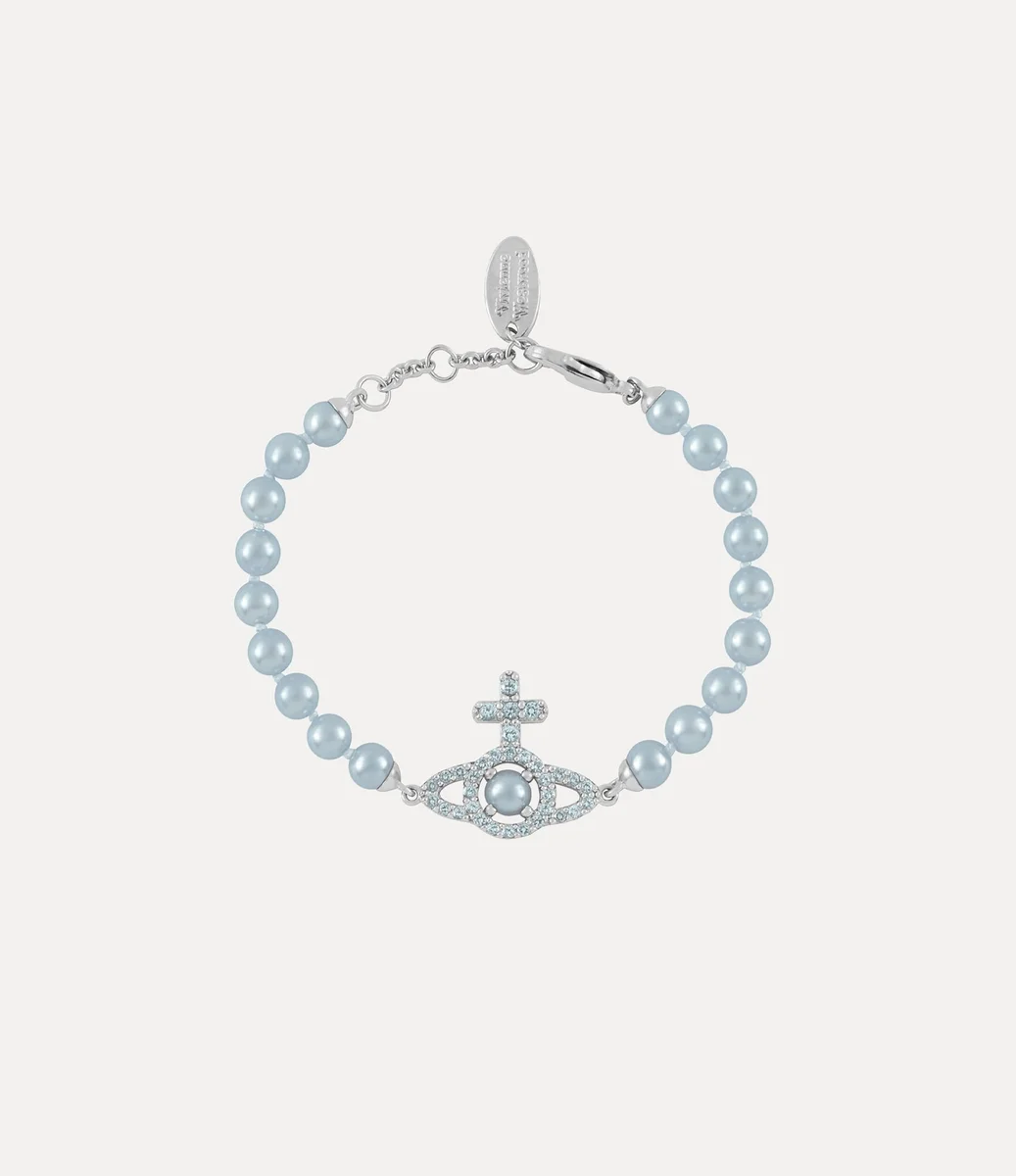 Pärlor är fortfarande ett viktigt inslag i husets ikonografi och efterliknar en känsla av förgången lyx. Olympia Pearl-armbandet är uppträdda med blå glasbaserade pärlor och har vår signatur silverfärgade kula i mitten, intrikat utsmyckad med pavé-satta kristaller.