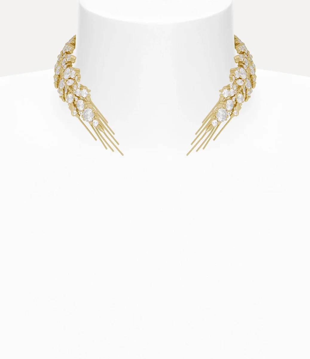 Chloris-halsbandet är inspirerat av grekisk mytologi och har två delikat sammanflätade vetemotiv som symboliserar välstånd, fertilitet och överflöd. Designen, som först introducerades i Andreas Kronthalers vår-sommarkollektion 2024, vilar elegant längs halsringningen, prydd med glittrande pavé-satta kristaller och avslutas med ett diskret gångjärnslås på baksidan.
