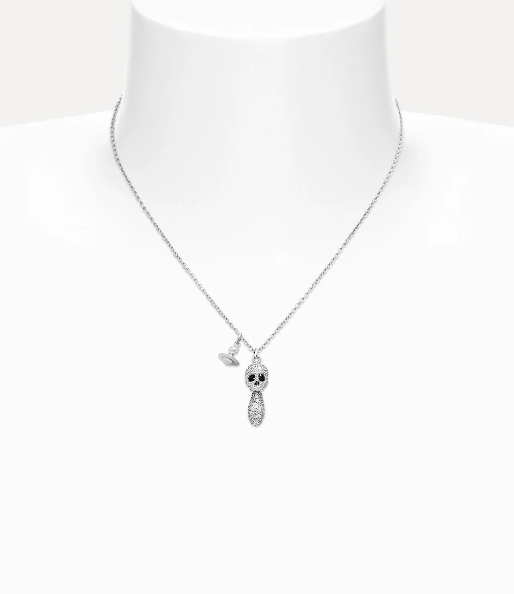 Vårt Circe Orb-halsband har ett centralt skallemotiv, ett traditionellt motiv för huset, prydd med rader av glittrande ädelstenar. Halsbandet kompletteras med en droppformad kristall och har en metallkul som hänger ned, vilket påminner om Viviennes vision om att föra traditionen in i framtiden.