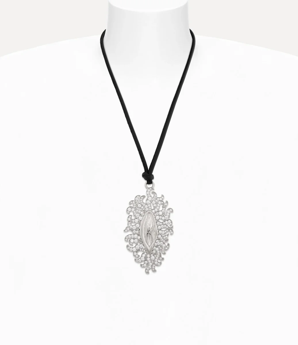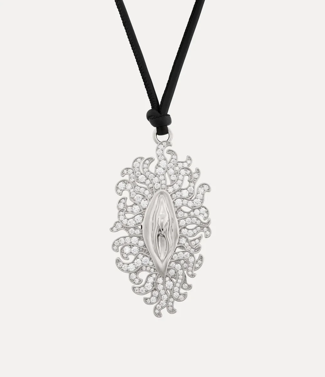 Floriana-halsbandet är inspirerat av husets ikoniska ”Vagina”-motiv, som först introducerades på Andreas Kronthalers för Vivienne Westwood höst-vinter 2019/2020-catwalk. Det djärva motivet, prytt med vita kristaller, hänger från en justerbar svart italiensk läderrem och återspeglar Viviennes beundran för antik konst, där det ofta förknippades med teman som fertilitet eller styrka.
