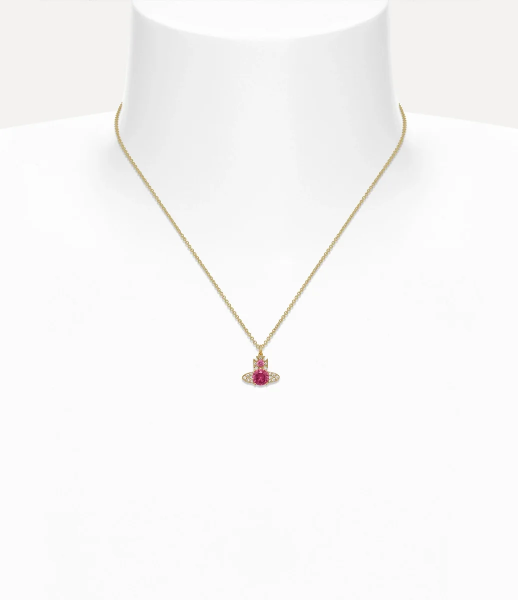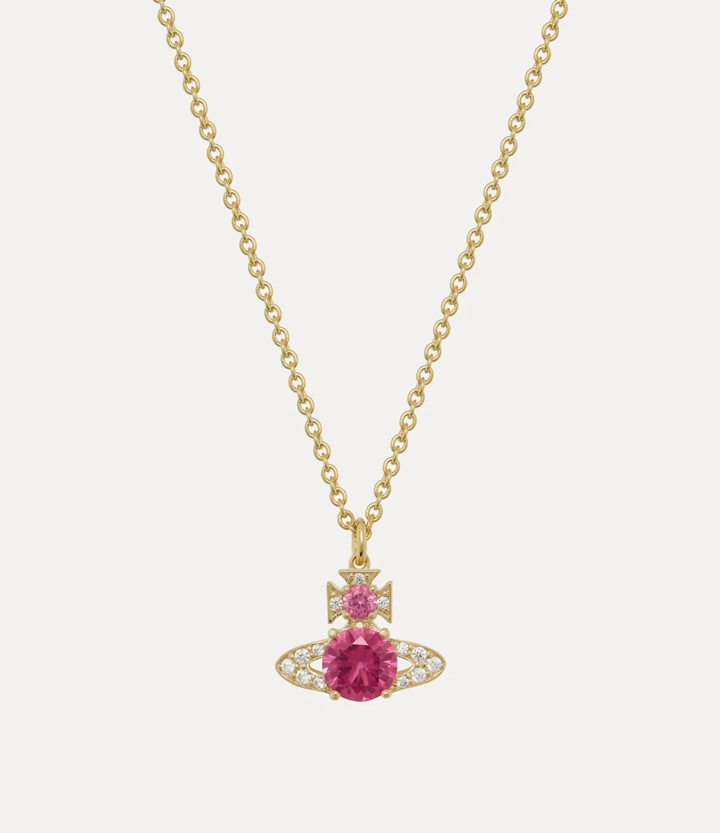 Vårt Ismene Pendant-halsband återkommer denna säsong i en polerad guldtonad finish, prydd med rosa och vita kristaller i en elegant pavéinfattning. Designen är detaljerad med fina utskärningar längs Saturnus ringar och kompletteras med en oval tagg, graverad med vår logotyp vid karbinhaken.
