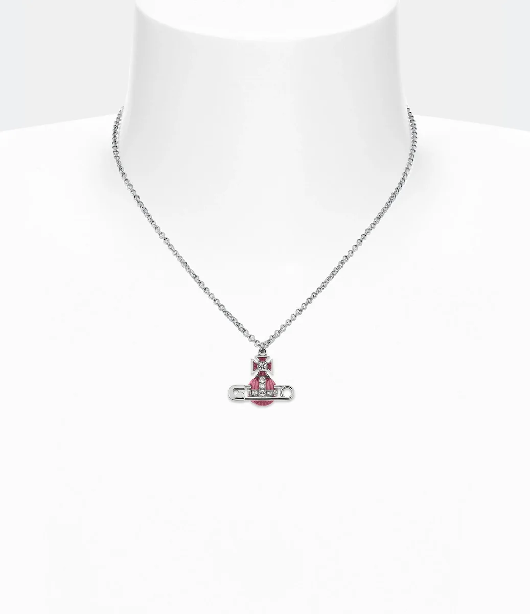 Vårt Kitty-halsband har vårt klassiska emblem, handmålat med genomskinlig rosenfärgad emalj som avslöjar ett intrikat metallmönster under. Smycket har en silverfärgad yta och kompletteras med ett säkerhetsnålsmotiv, en symbol för nonkonformism som påminner om Viviennes signaturstil inom punken.