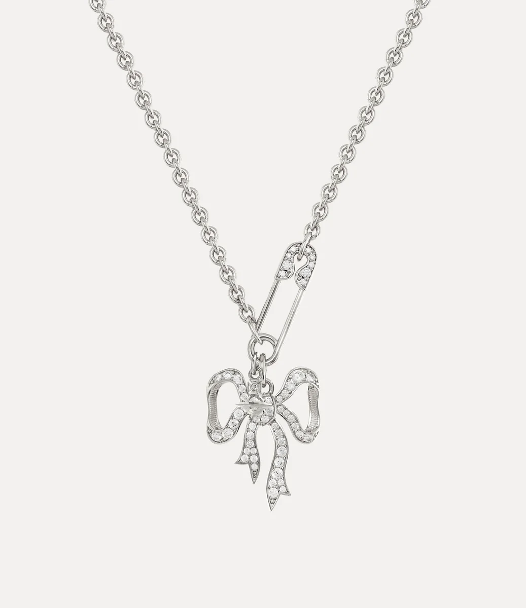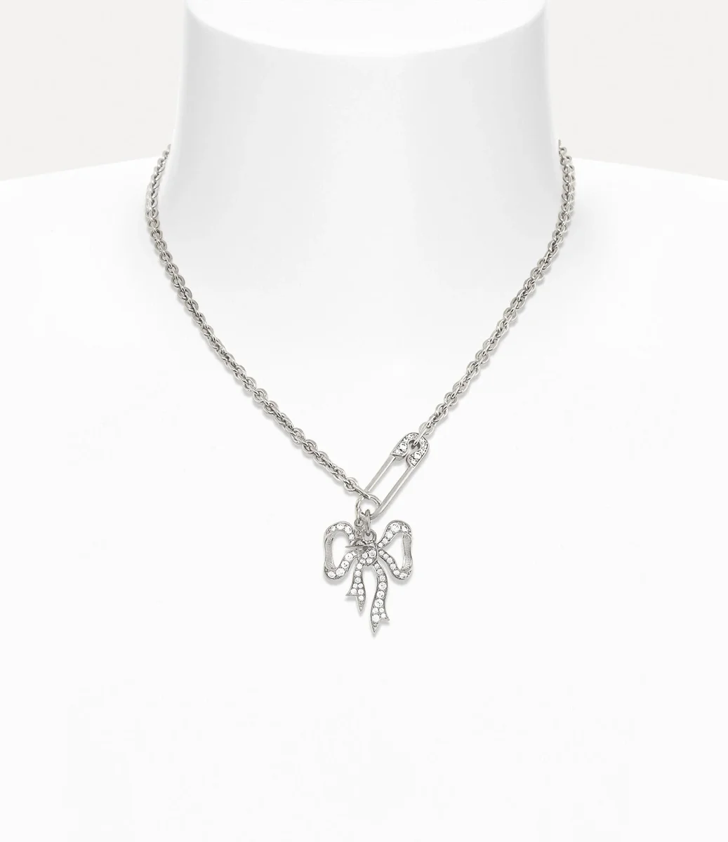 Lilith-halsbandet har husets signaturikonografi, där en georgiansk inspirerad rosett kombineras med en säkerhetsnålssilhuett som anspelar på Viviennes punkestetik. Det silverfärgade smycket är prytt med vita kristaller och har ett säkert karbinhake-lås och en orb-märkt tagg.