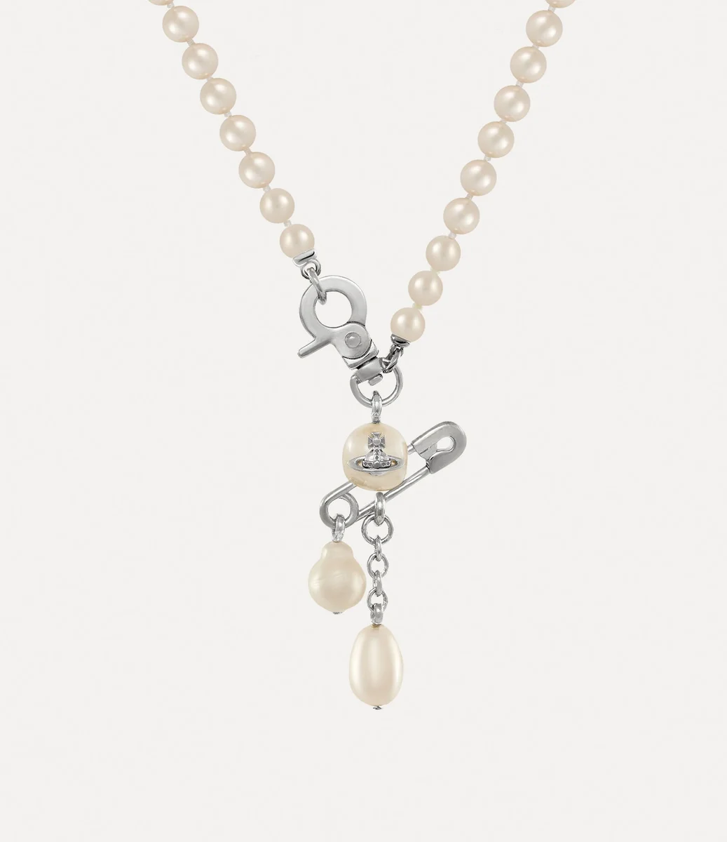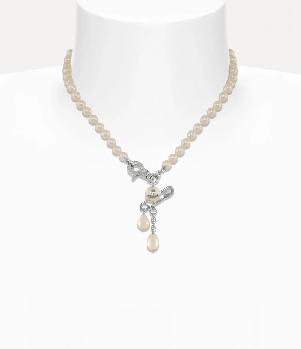Det klassiska Small Claude Pearl-halsbandet har uppdaterats denna säsong med en rad glittrande Swarovski-glaspärlor, med en rundad pärldetalj i mitten och en klassisk säkerhetsnål som går igenom designen – vilket påminner om Viviennes signaturpunkestetik.