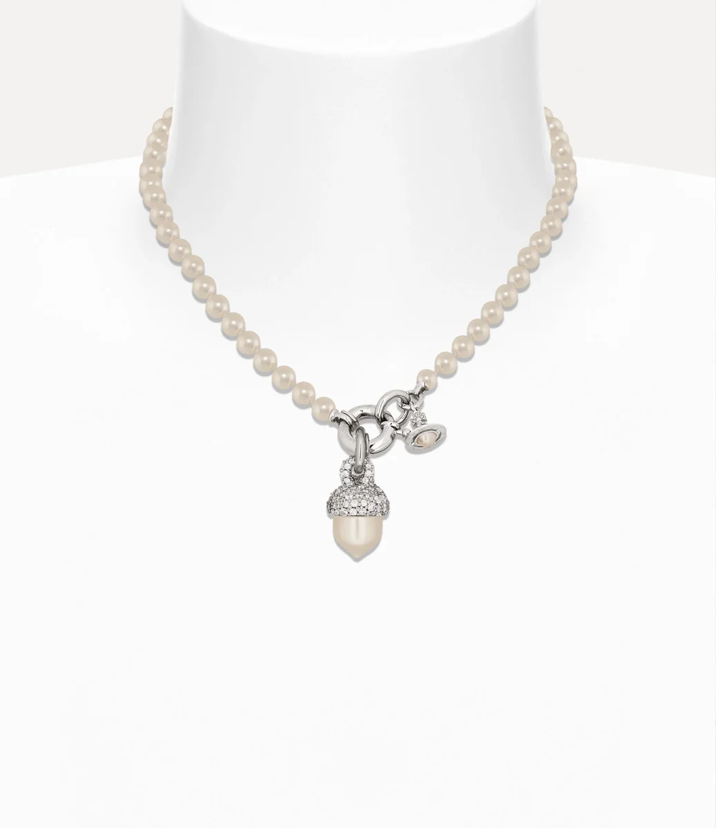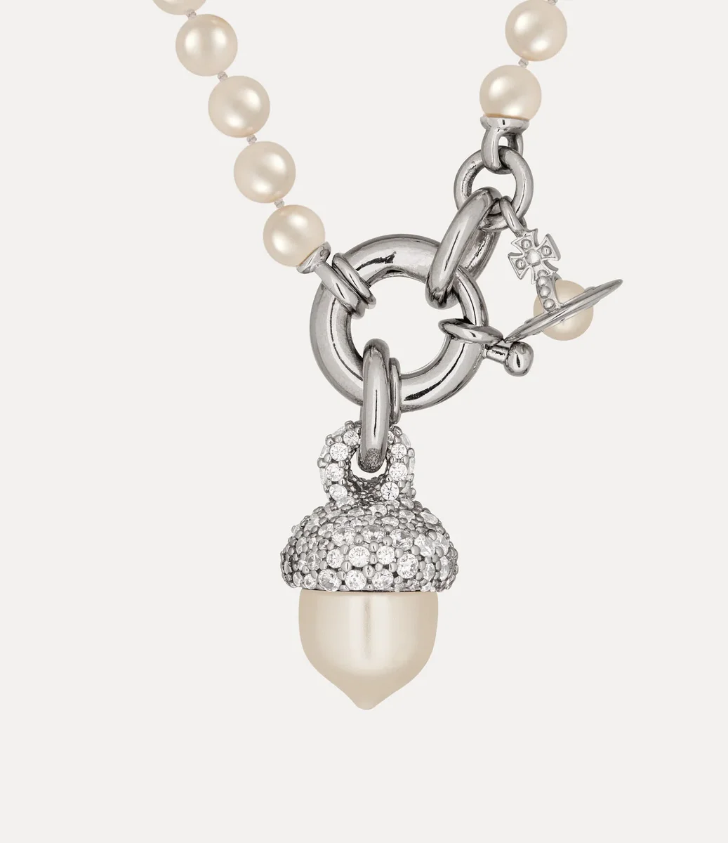 Lucille Pearl-halsbandet ger en känsla av storhet och lyx med sin rad av glittrande Swarovski-glaspärlor. I mitten hänger ett pavé-utsmyckat ekollonmotiv med en glänsande pärlfinish tillsammans med en pärlklot, inneslutna i en polerad silverfärgad metallram.