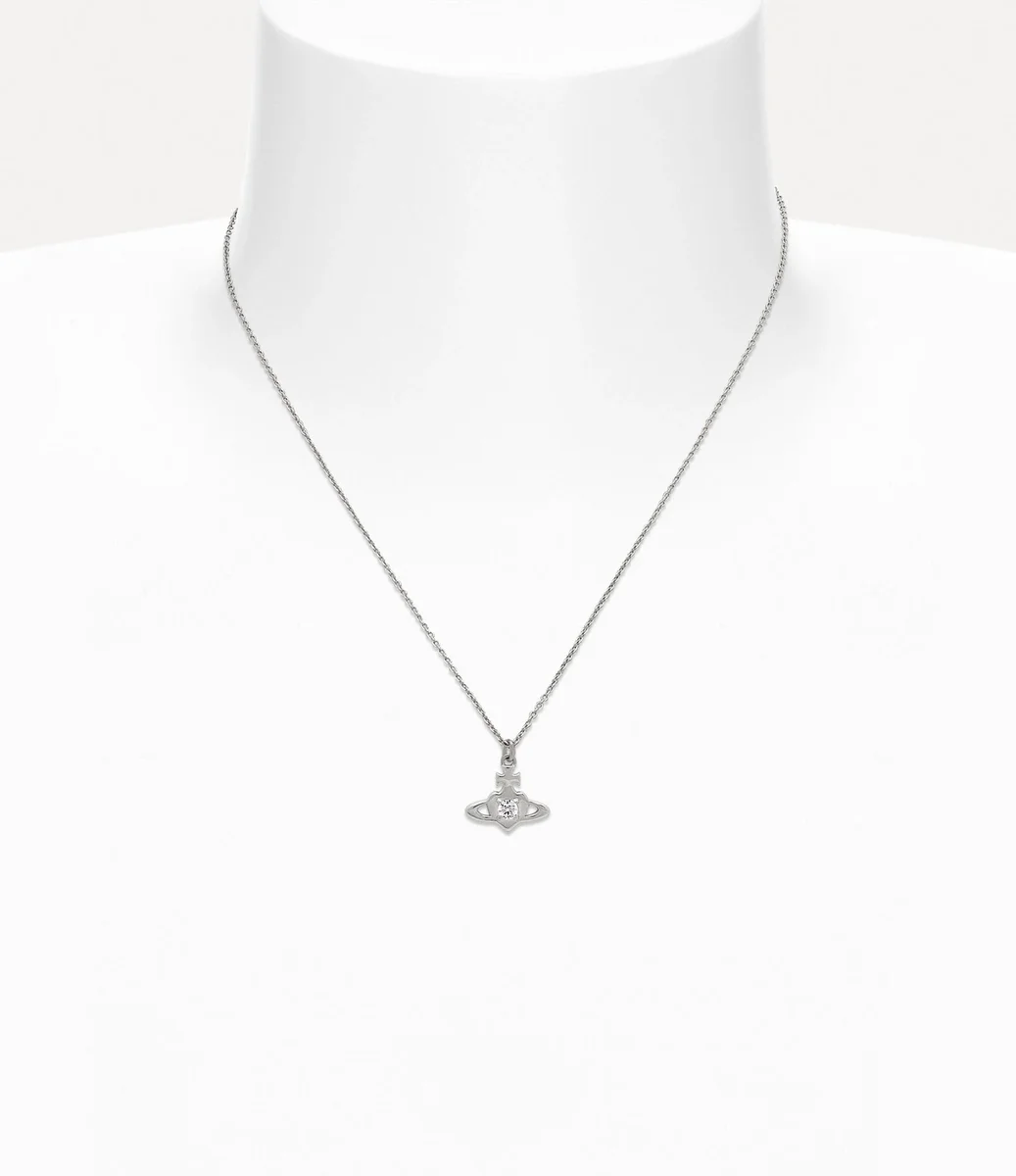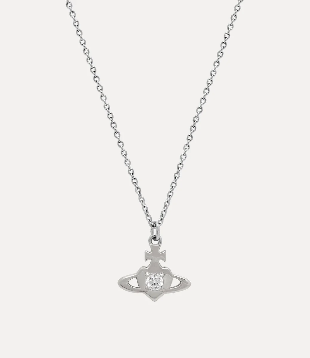 Vårt Noella-halsband har en platinafärgad yta och är prydd med ett hjärtformigt motiv som påminner om Viviennes kärlek till mänskligheten och planeten. Smycket är tillverkat av återvunnet silver och har en vit kristall inbäddad i mitten av designen.
