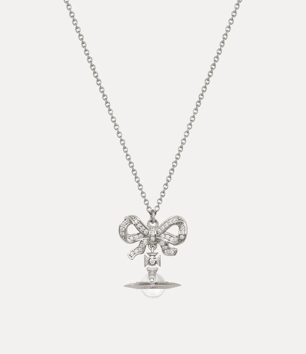 Vårt Octavie-halsband är tillverkat av återvunnet silver och har en polerad platinafärgad plätering. Designen är utsmyckad med glittrande vita kristaller och kombinerar en rosett i georgiansk stil med vår signaturtrekantiga kula i mitten, som återspeglar husets klassiska kulmotiv.