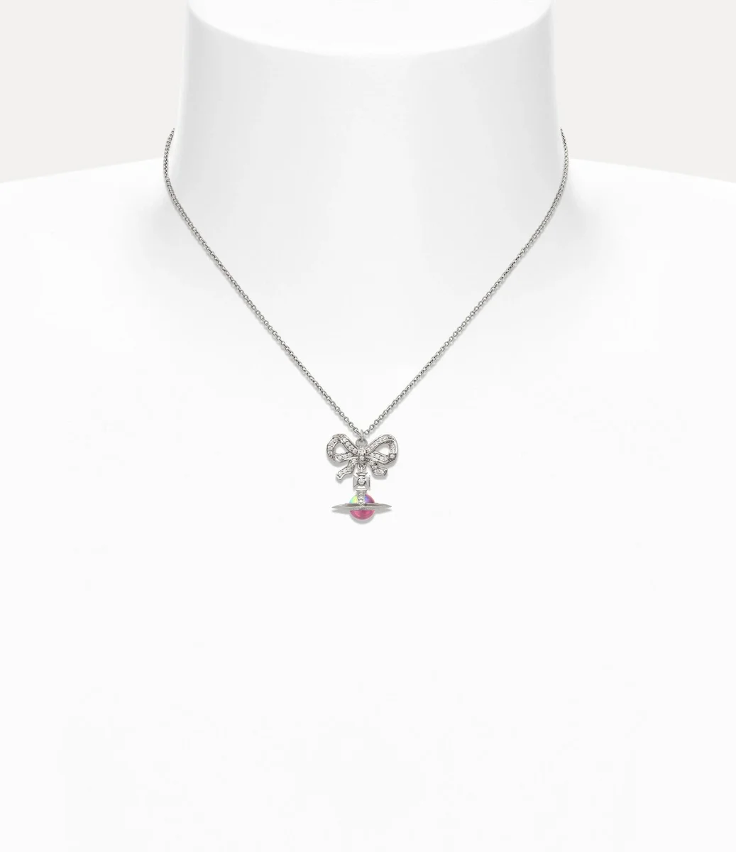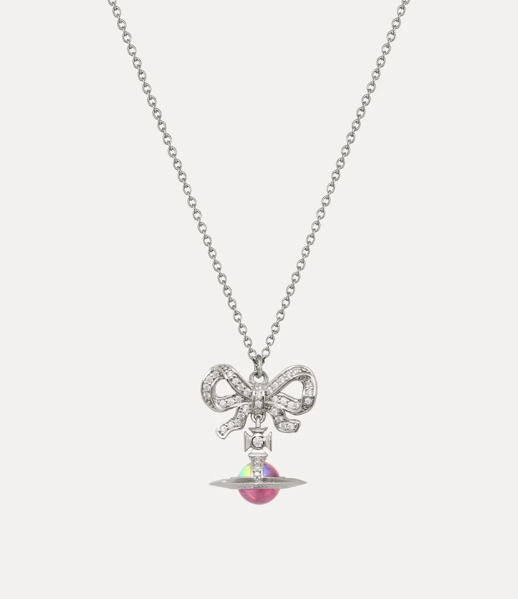 Vårt Octavie-halsband är tillverkat av återvunnet silver och har en polerad platinafärgad plätering. Designen är utsmyckad med glittrande vita kristaller och kombinerar en rosett i georgiansk stil med vår signaturtrekantiga kula i mitten, som har en rosa iriserande yta som återspeglar husets klassiska kulmotiv.