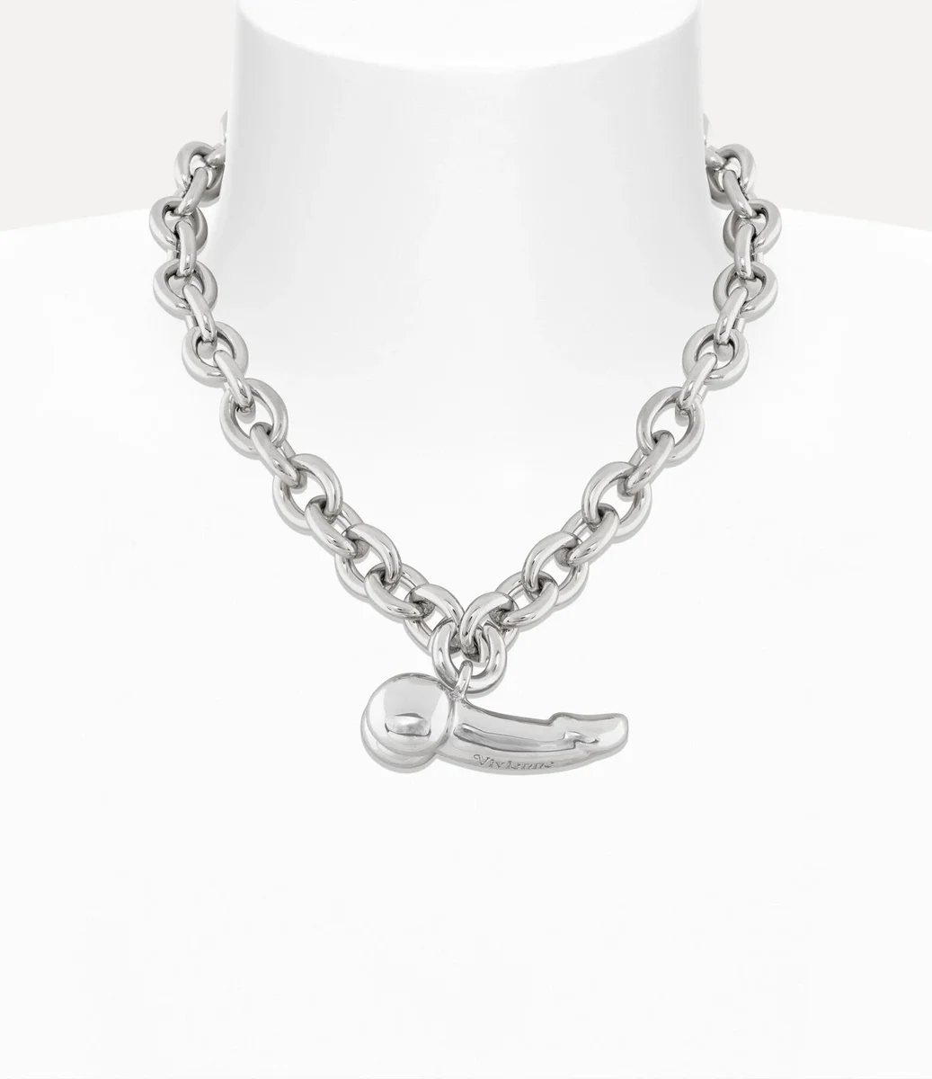 Penis-halsbandet påminner om Viviennes beundran för antik konst, där det djärva motivet ofta användes för att symbolisera fertilitet eller styrka. Modellen finns i en polerad, silverfärgad finish, komplett med en kraftig kabelkedja och ett säkert lås.