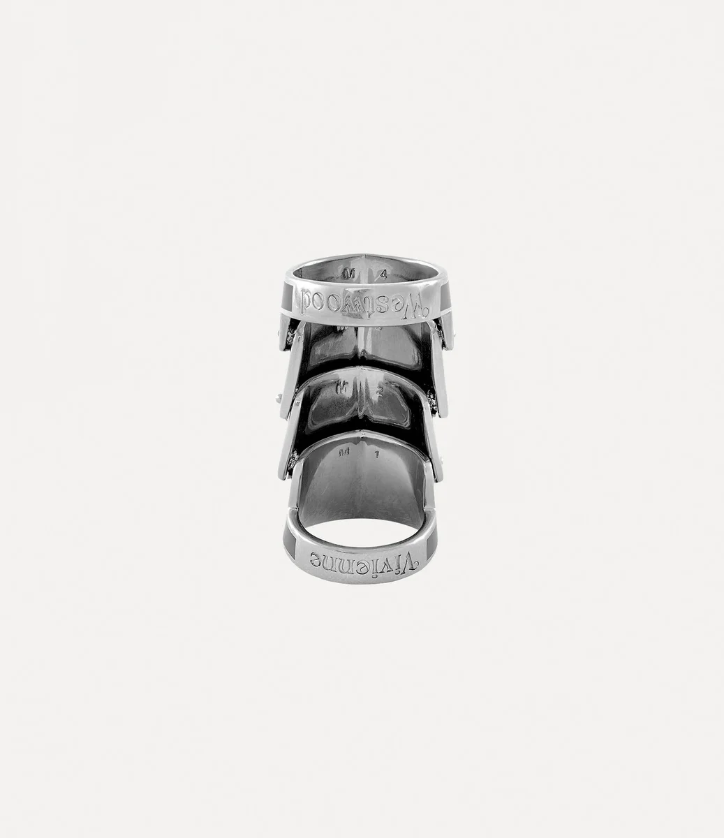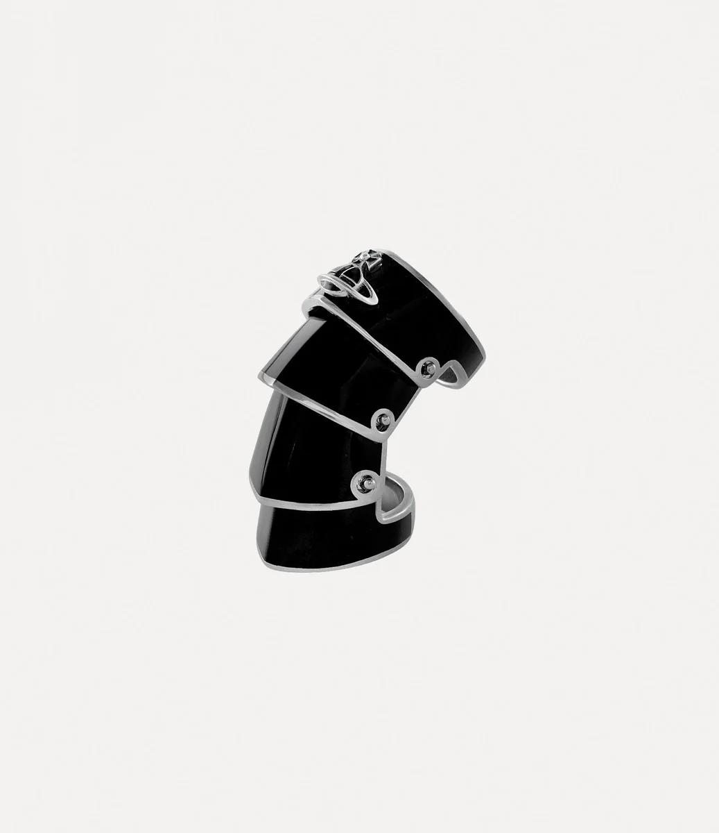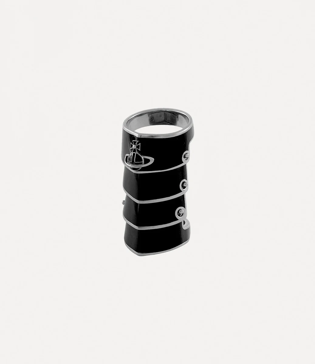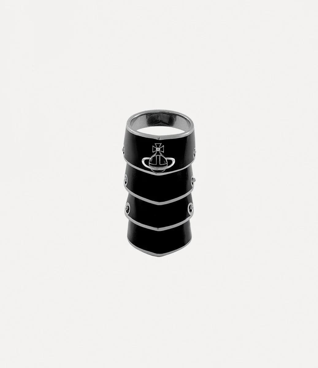 Artemis-ringen efterliknar designen på de rustningsinspirerade jackorna från Vivienne Westwoods kollektion ”Time Machine” från 1988, vilket speglar Viviennes djupa fascination för Wallace Collection. Smycket har handmålade emaljdelar som överlappar varandra, prydda med vårt signaturmotiv – en kula – som förkroppsligar etoset att ta med sig det förflutna in i framtiden.