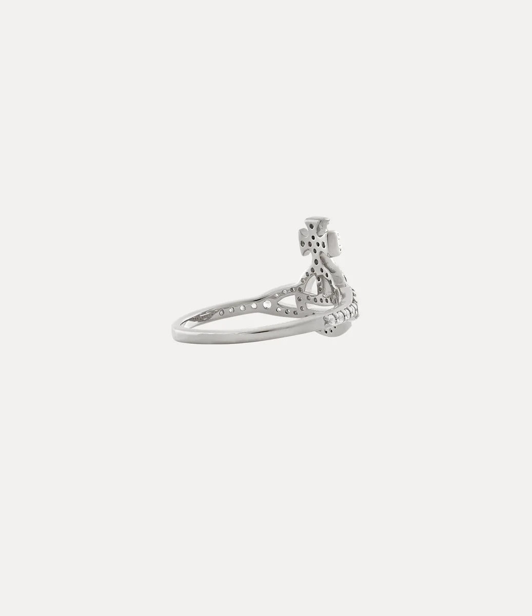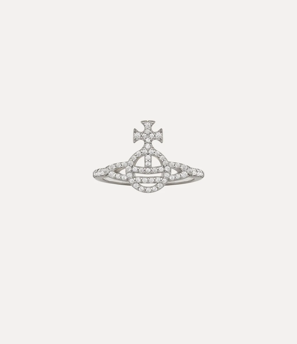 Vår Calliope-ring har en delikat ring som är prydd med pavékristaller i vita nyanser, som följer formen på klotmotivet på framsidan av designen – synonymt med Viviennes vision om att föra traditionen in i framtiden. Smycket har intrikat graverade detaljer, kompletterade med vår signaturtypografi på insidan av ringen.