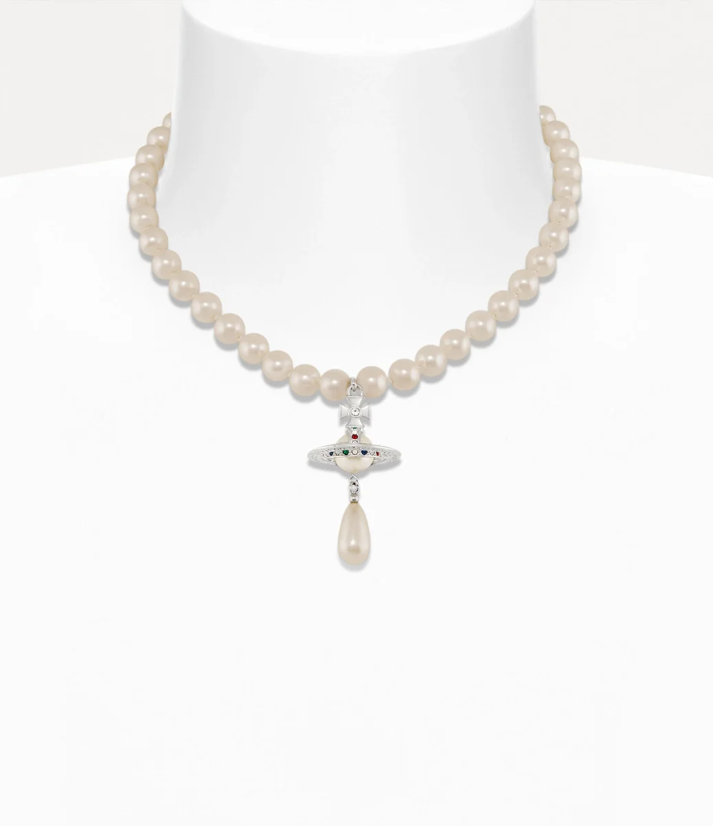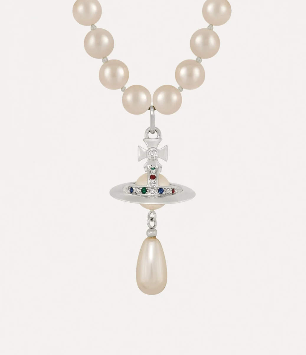 I slutet av 1980-talet presenterade Vivienne Westwood sitt ikoniska pärlkoncept under Harris Tweed Fall 1987-modevisningen, med ett enkelradigt halsband. Vårt One Row Pearl Drop-halsband återspeglar den eleganta formen i hennes ursprungliga design, med ett tredimensionellt orb-motiv prydd med kristallaccenter och en hängande droppformad pärla.