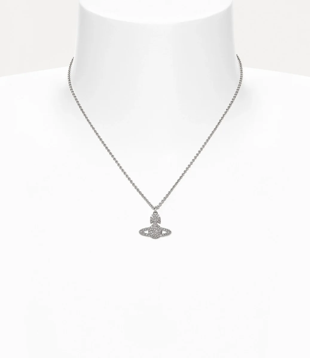 Grace Bas Relief Pendant-halsbandet är en hyllning till Viviennes vision om att föra traditionen in i framtiden, med ett tvådimensionellt globmotiv i mitten av designen. Smycket har en yta av vita kristaller som pryder silhuetten, kompletterad med polerad, silverfärgad plätering.