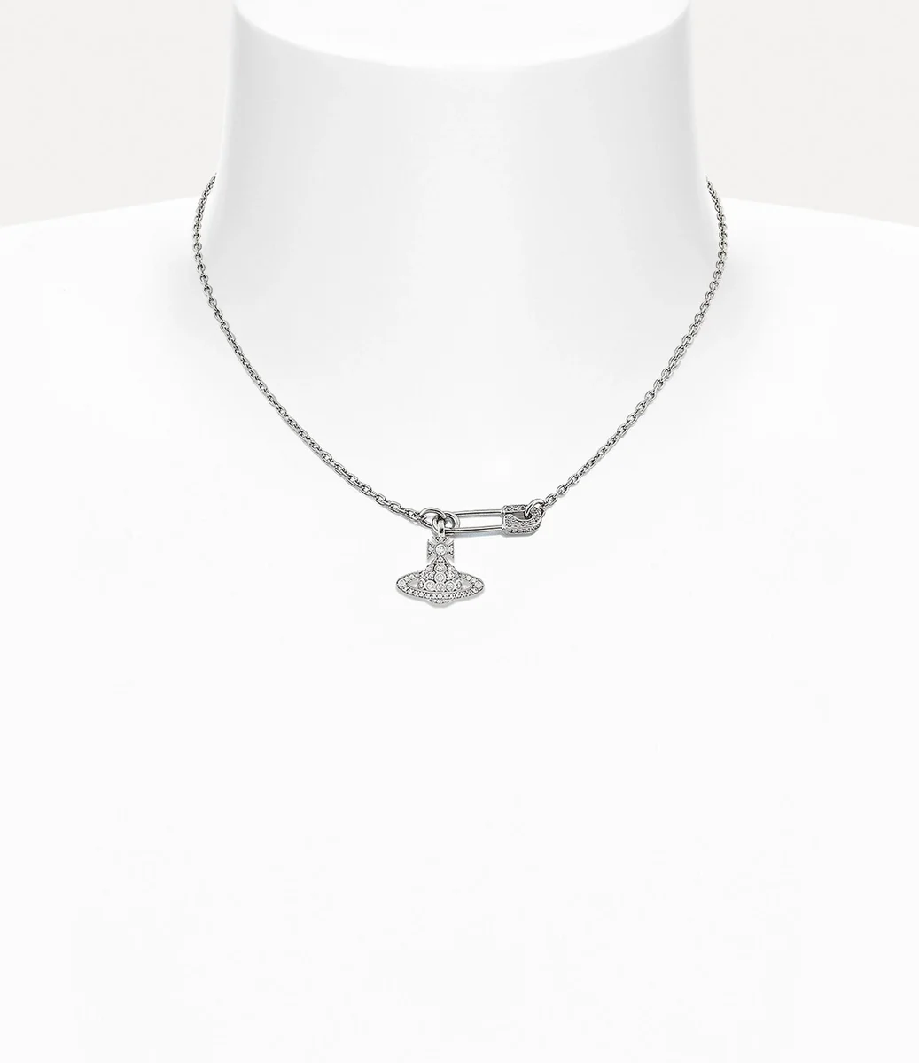 Vårt Lucrece halsband har kristallförsedda detaljer i polerade silvertoner, accentuerade av vårt signaturmotiv med säkerhetsnål tillsammans med den ikoniska globdesignen. Säkerhetsnålen, en tidlös symbol för nonkonformism, speglar Viviennes distinkta punkinspirerade vision.
