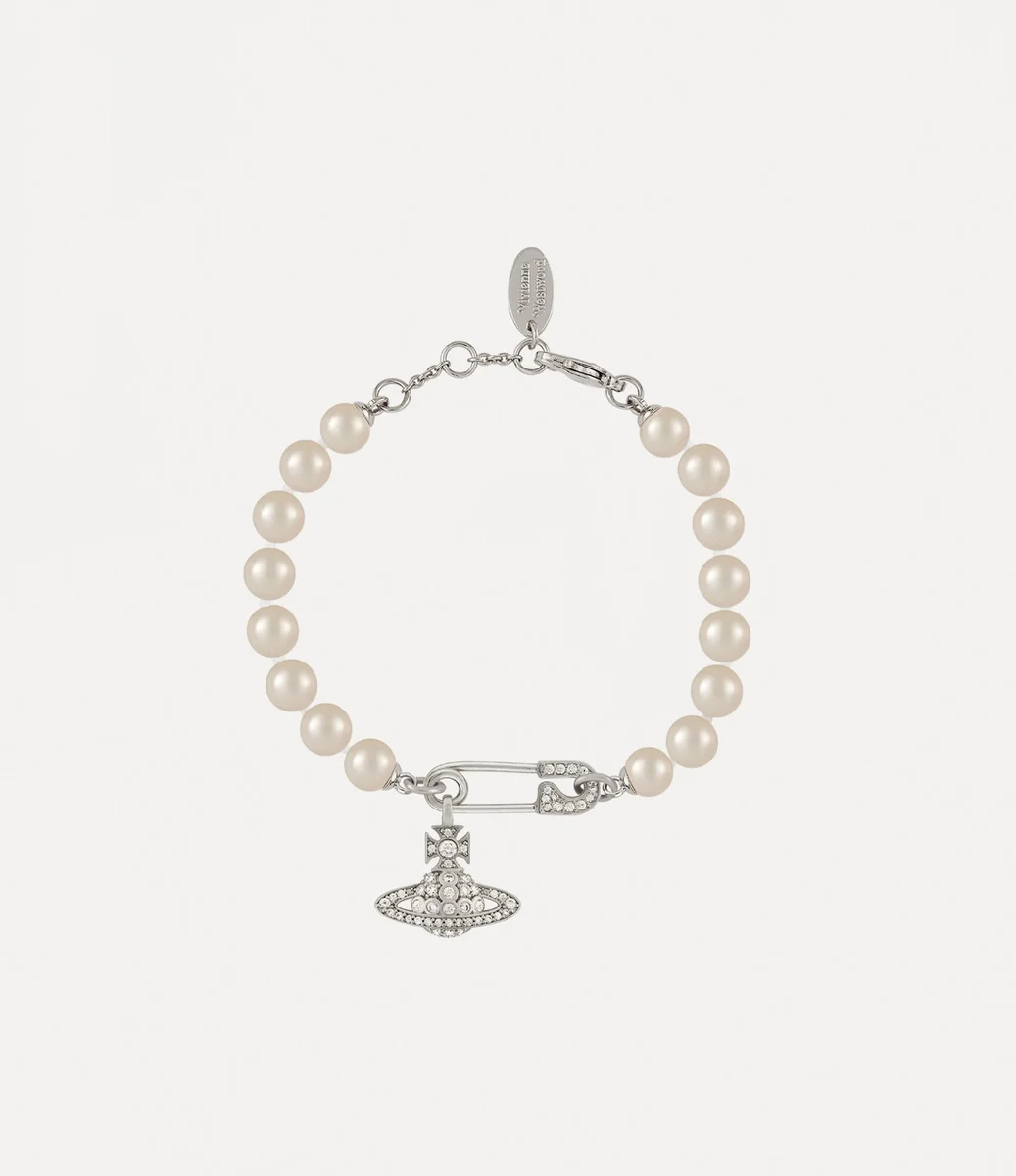 Pärlor är ett viktigt element i husets ikonografi och representerar både lyx och rebelliskhet. Lucrece Pearl-armbandet har en sträng av glasbaserade pärlor, accentuerade av en kristallbesatt kula som hänger från en säkerhetsnålsberlock. Detta tidlösa säkerhetsnålsmotiv symboliserar nonkonformism och speglar Viviennes signaturpunkinspirerade approach.